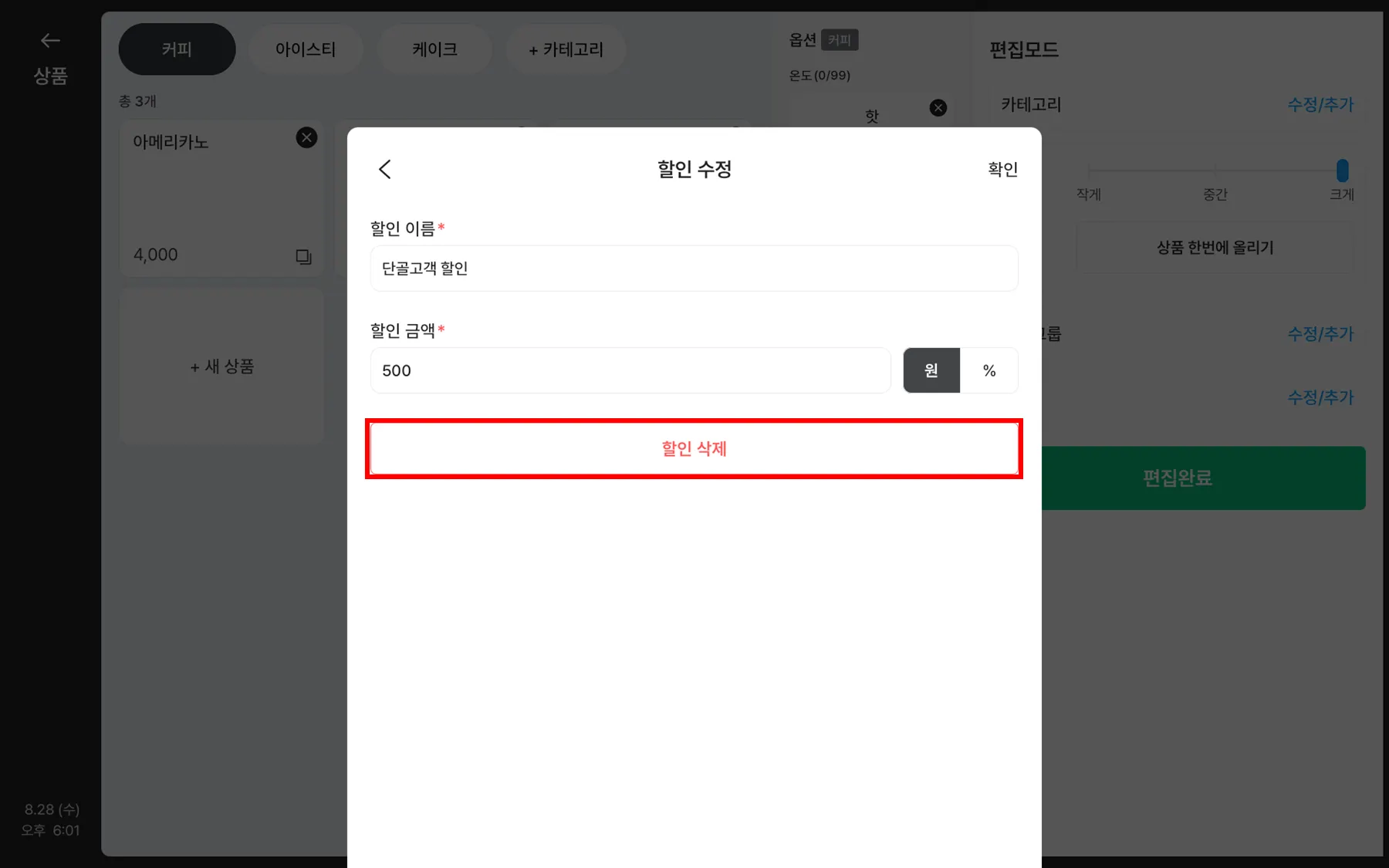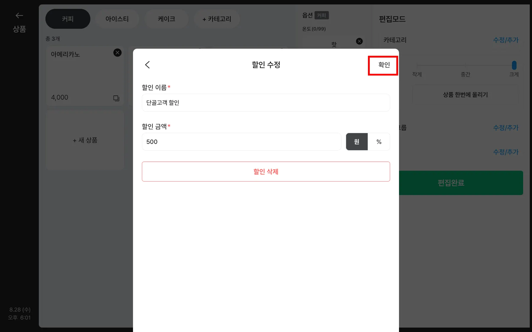 할인 내용 수정 완료 후 확인을 눌러 주세요.