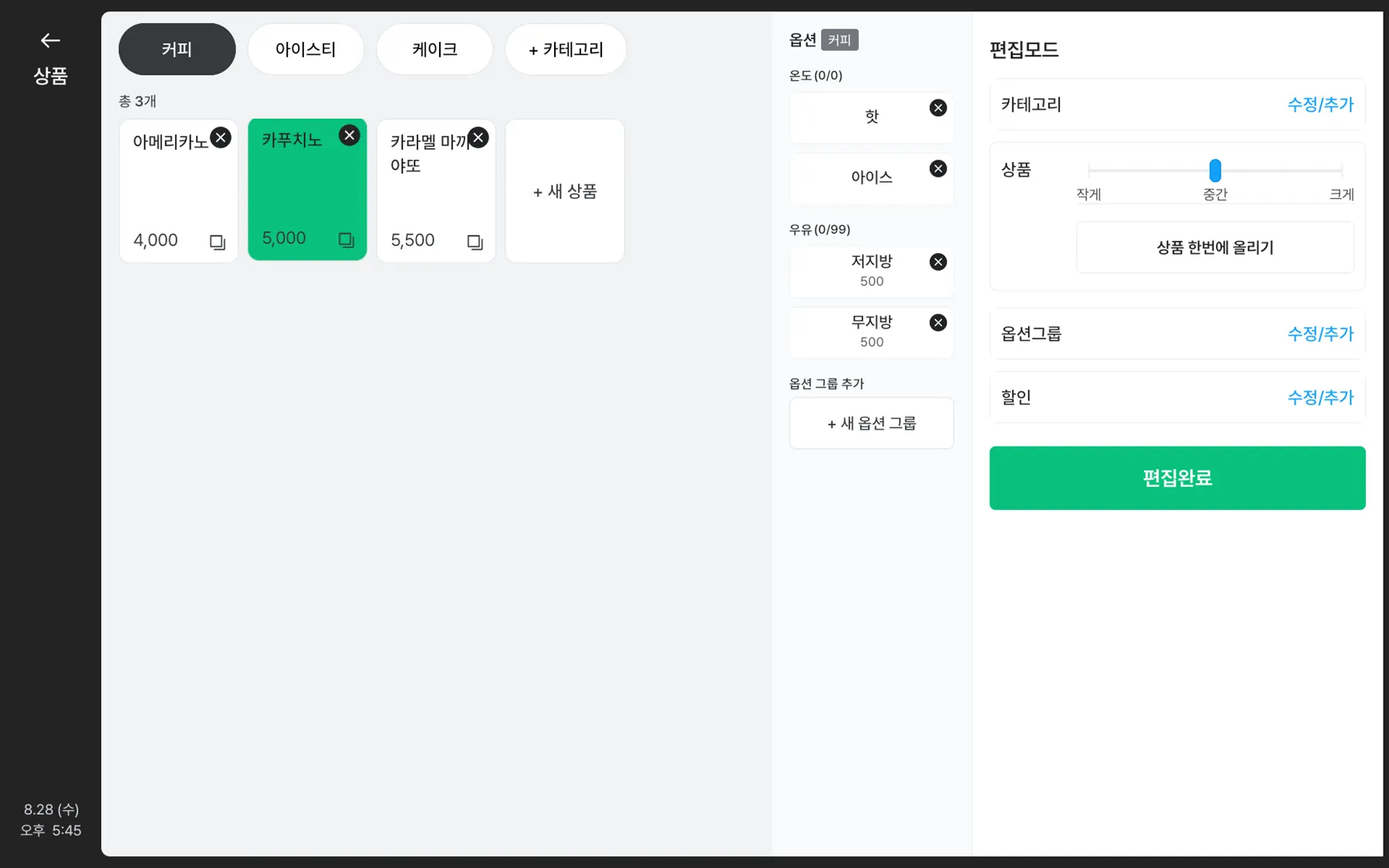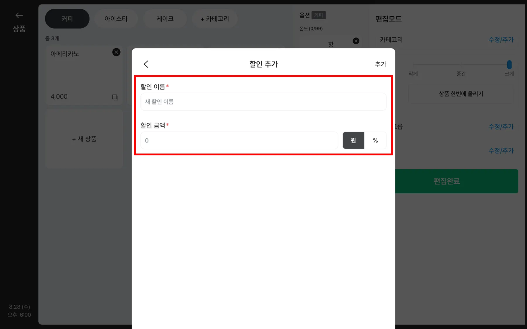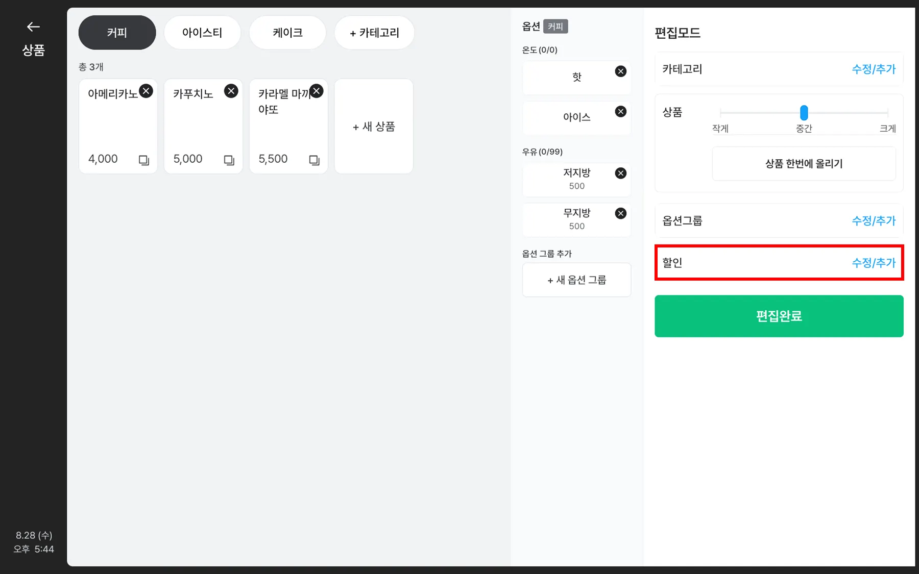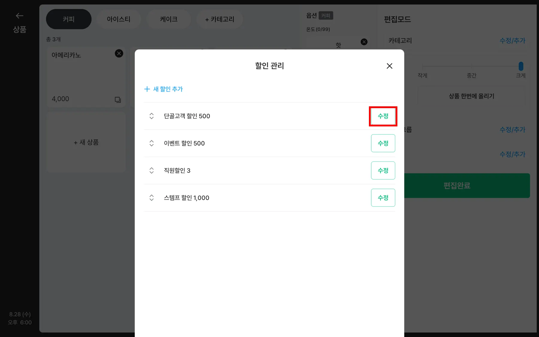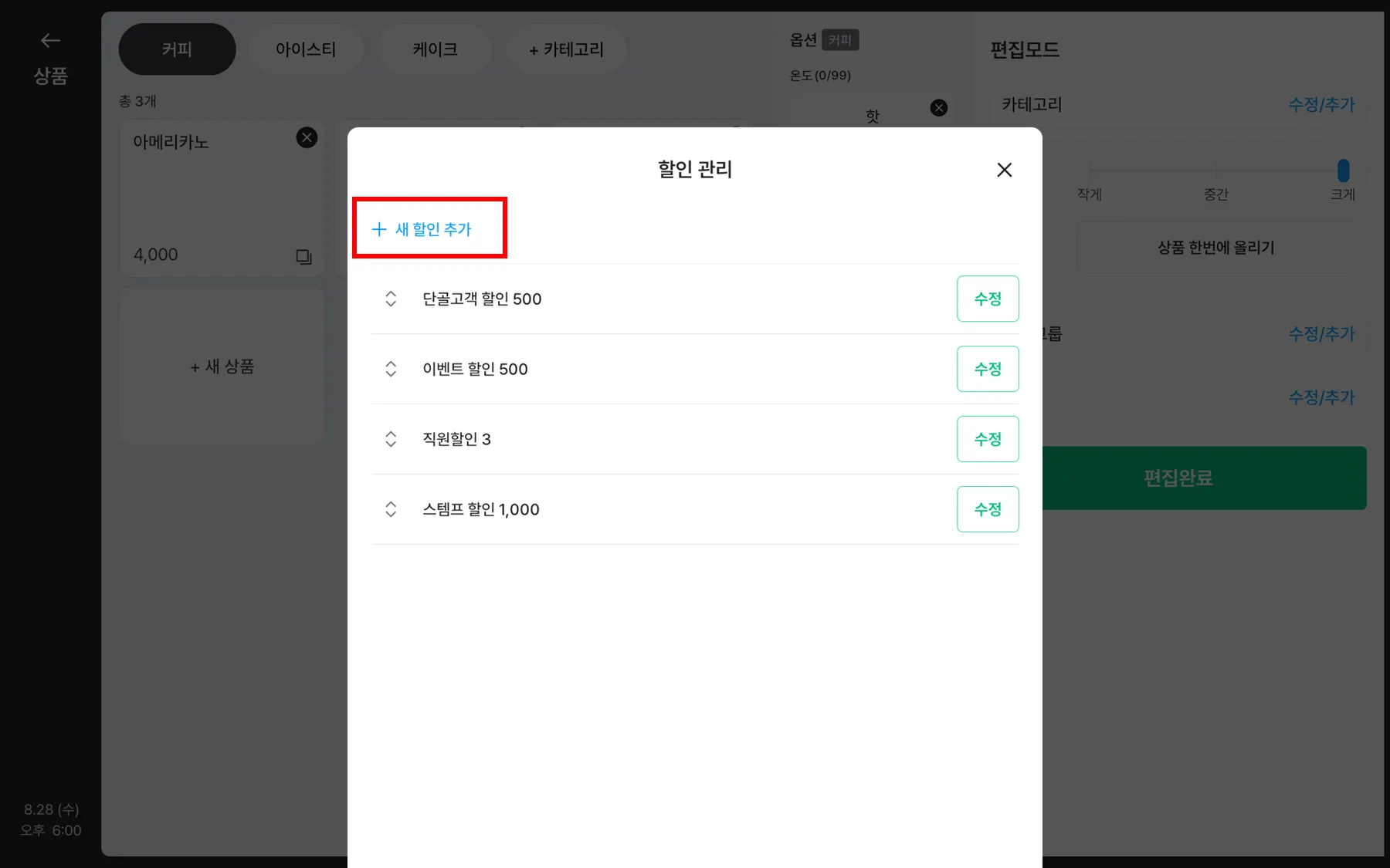 자주 사용하는 할인 추가/수정/삭제 를 설정할 수 있어요.