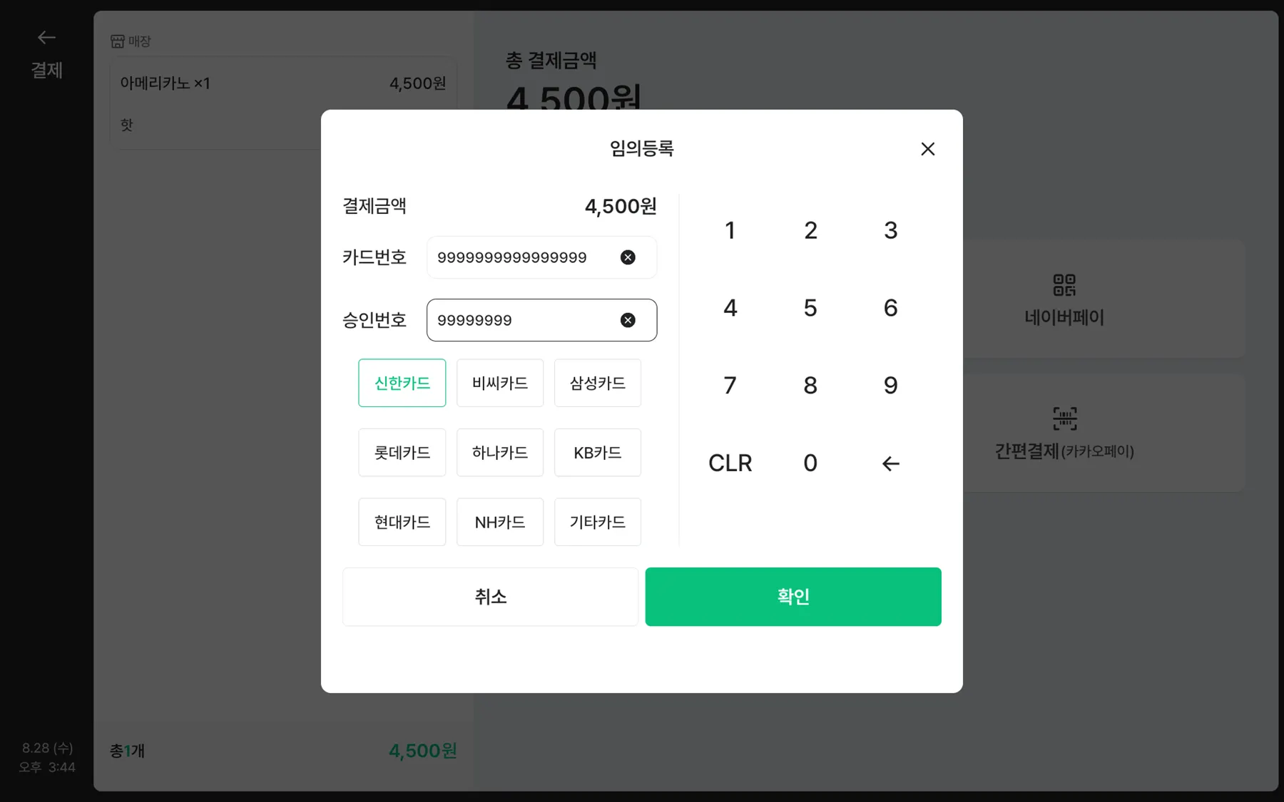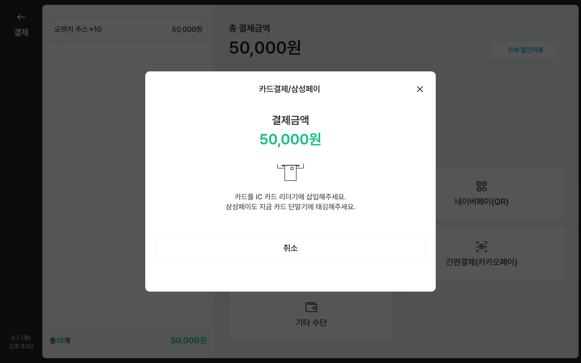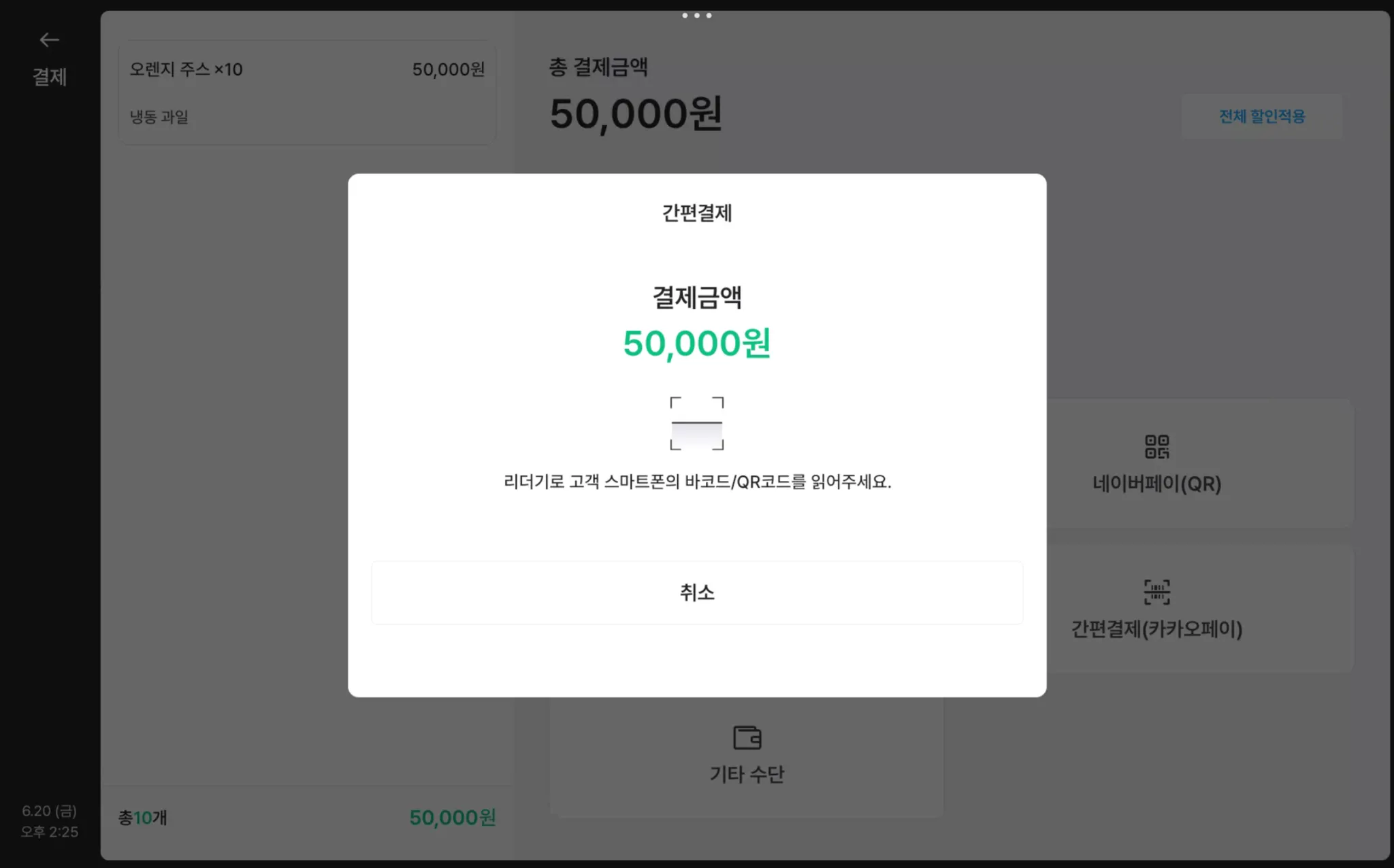 결제 단말기를 통해 카드/바코드를 인식해주세요.