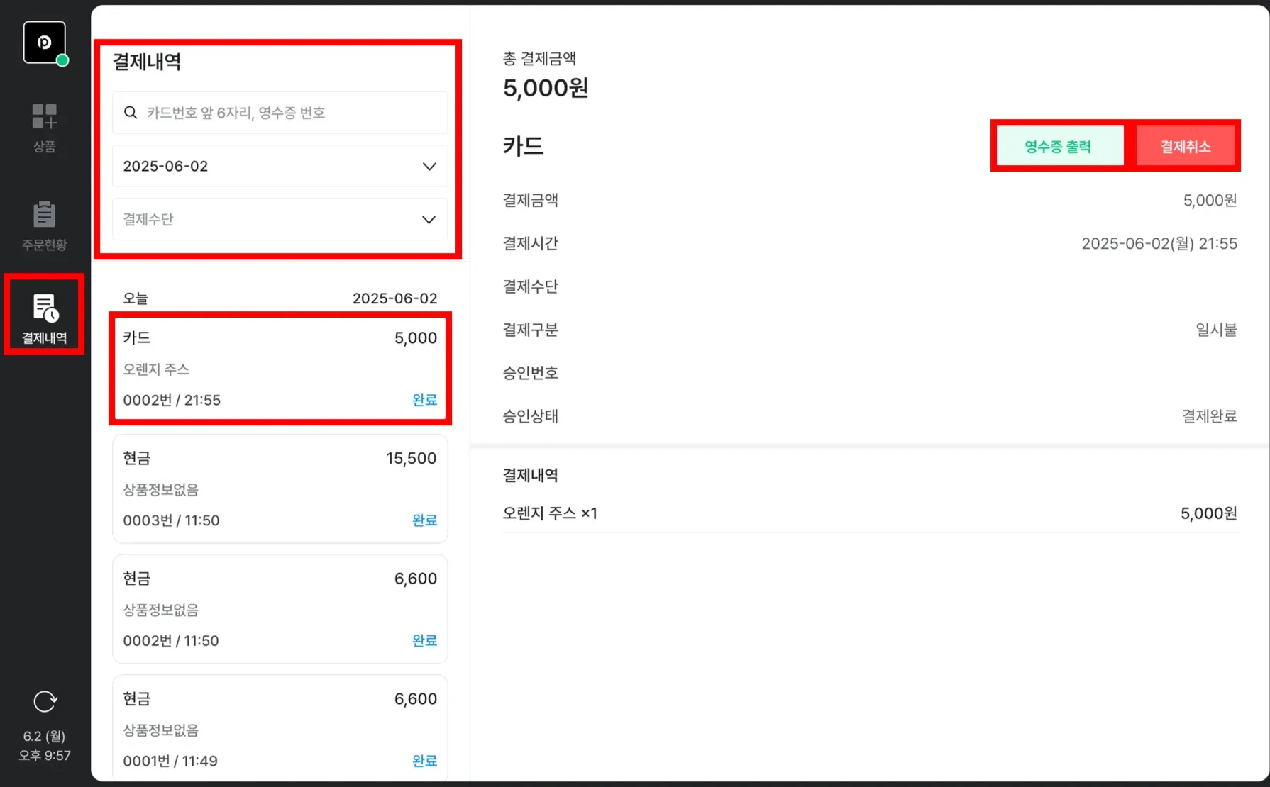 결제 건 상세내역과 영수증 출력, 결제 취소(반품)를 할 수 있어요.