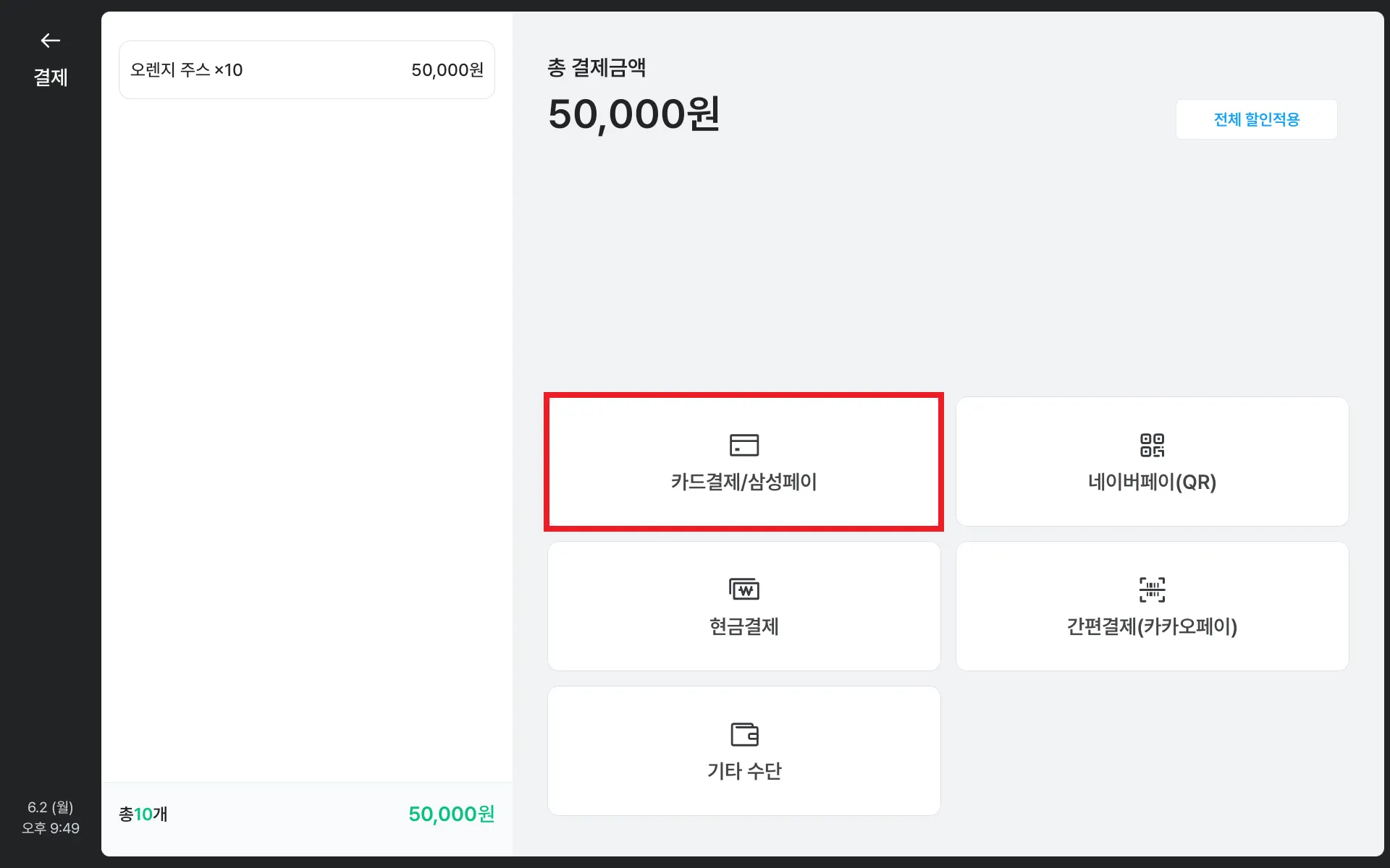 결제 화면의 전체 할인적용 버튼을 선택해주세요.