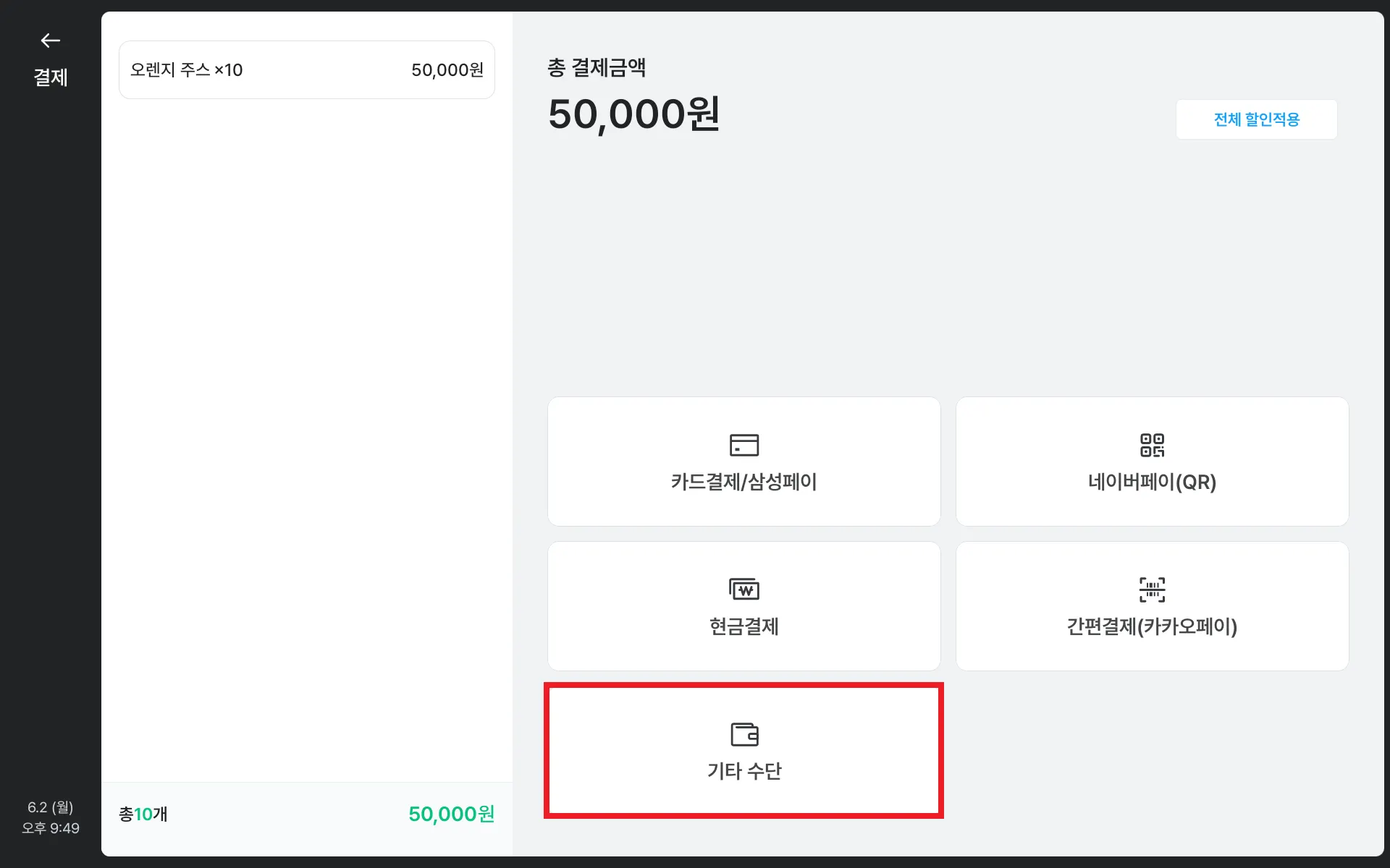 포스 사용이 불가하여 단말기에서만 결제한 경우 기타 수단을 선택하여 임의 등록 처리해주세요.