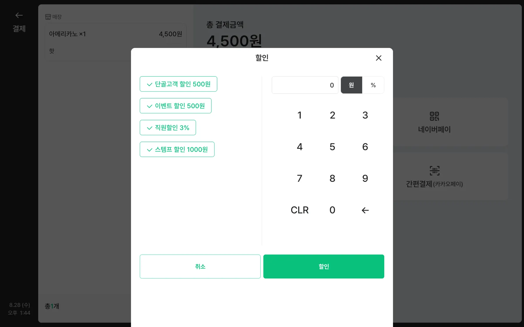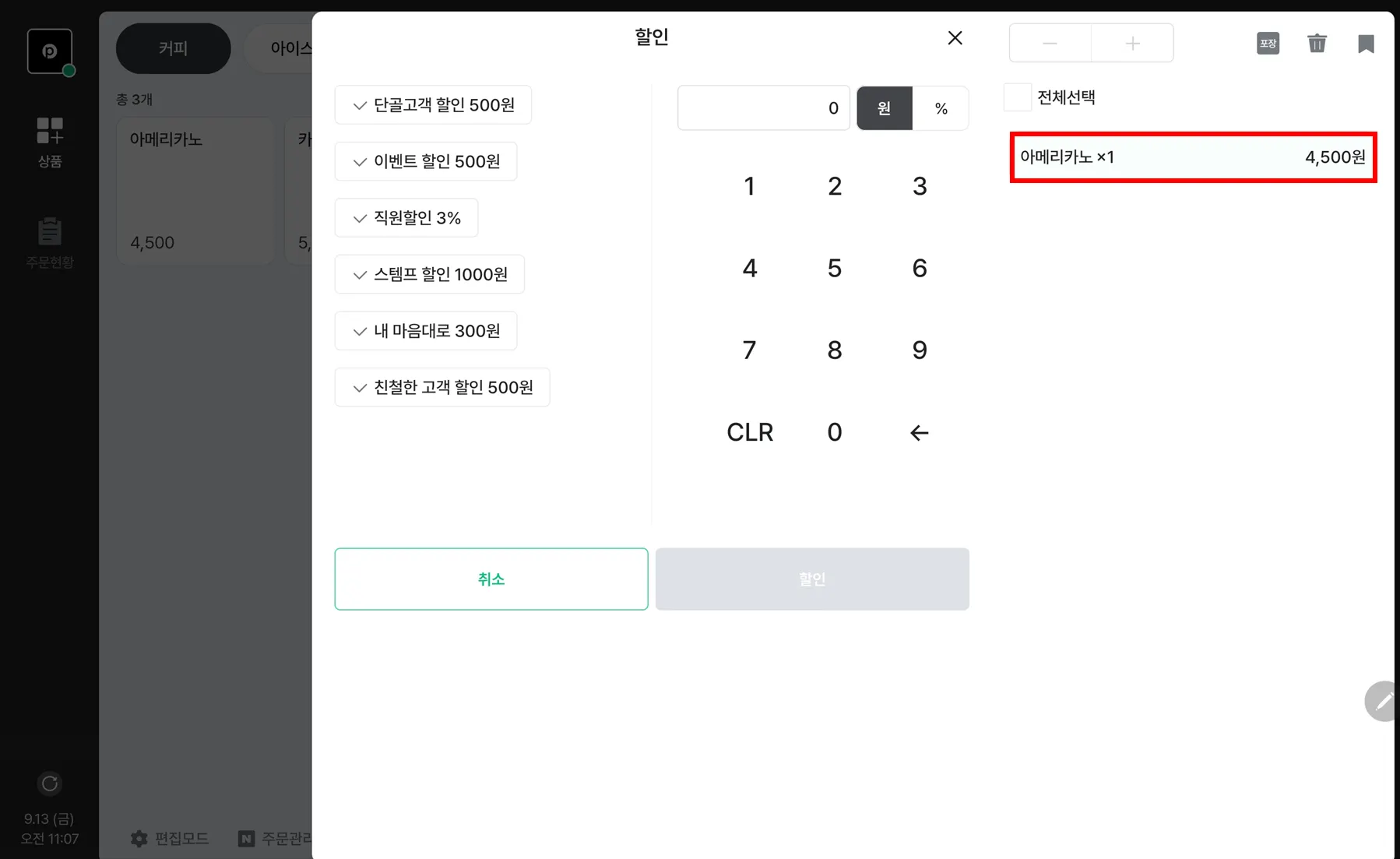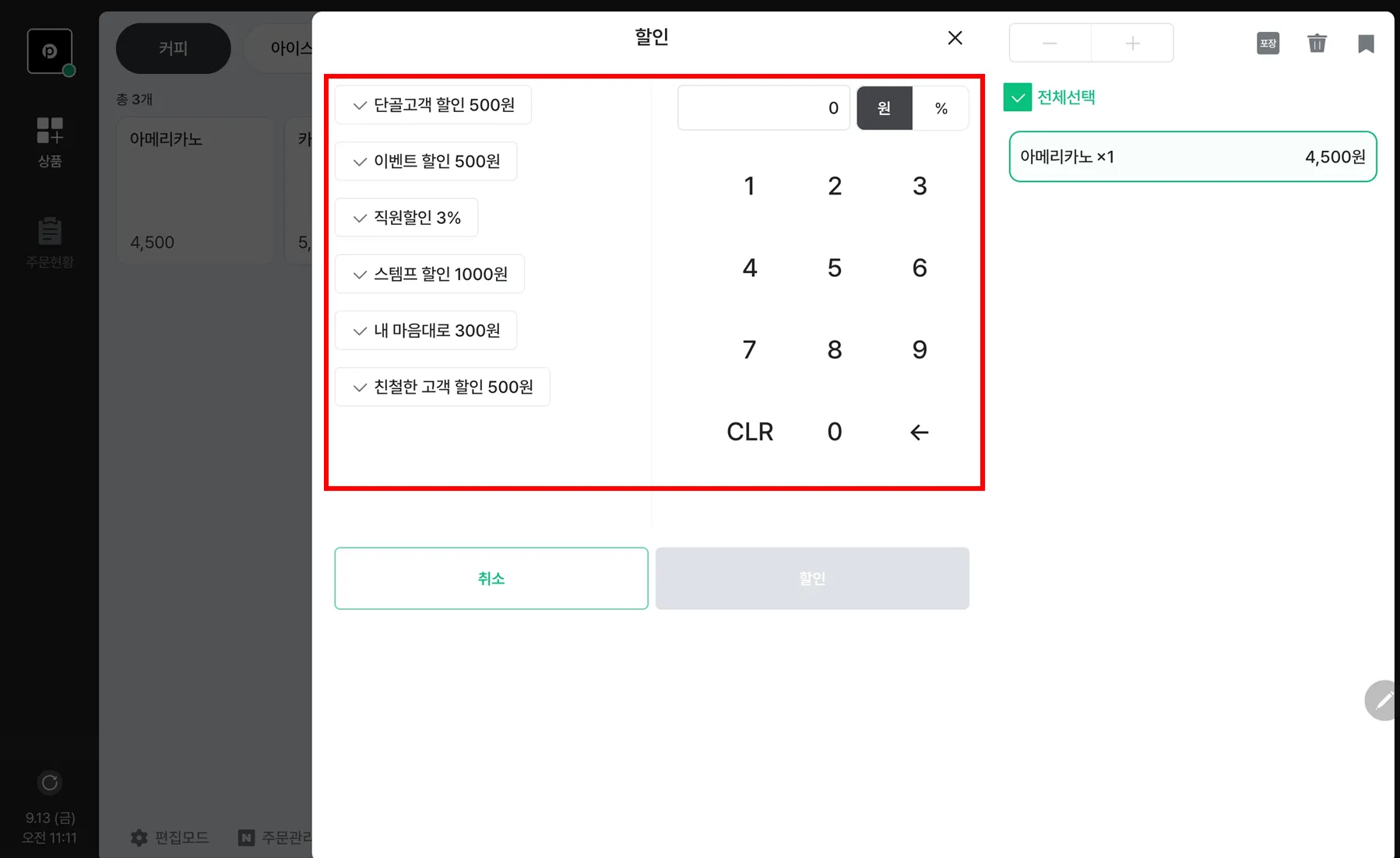 전체할인적용되는 카테고리는 숫자 키패드 포함 최대 4개 를 선택할 수 있어요.