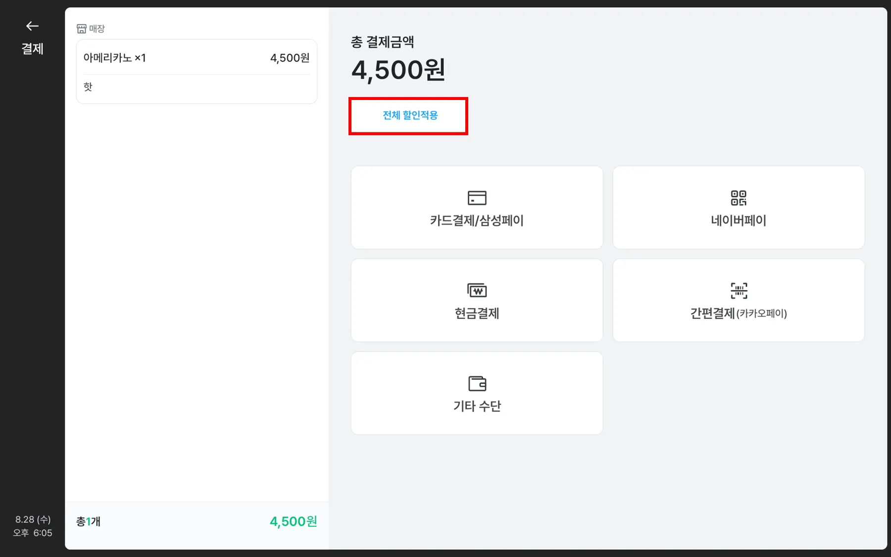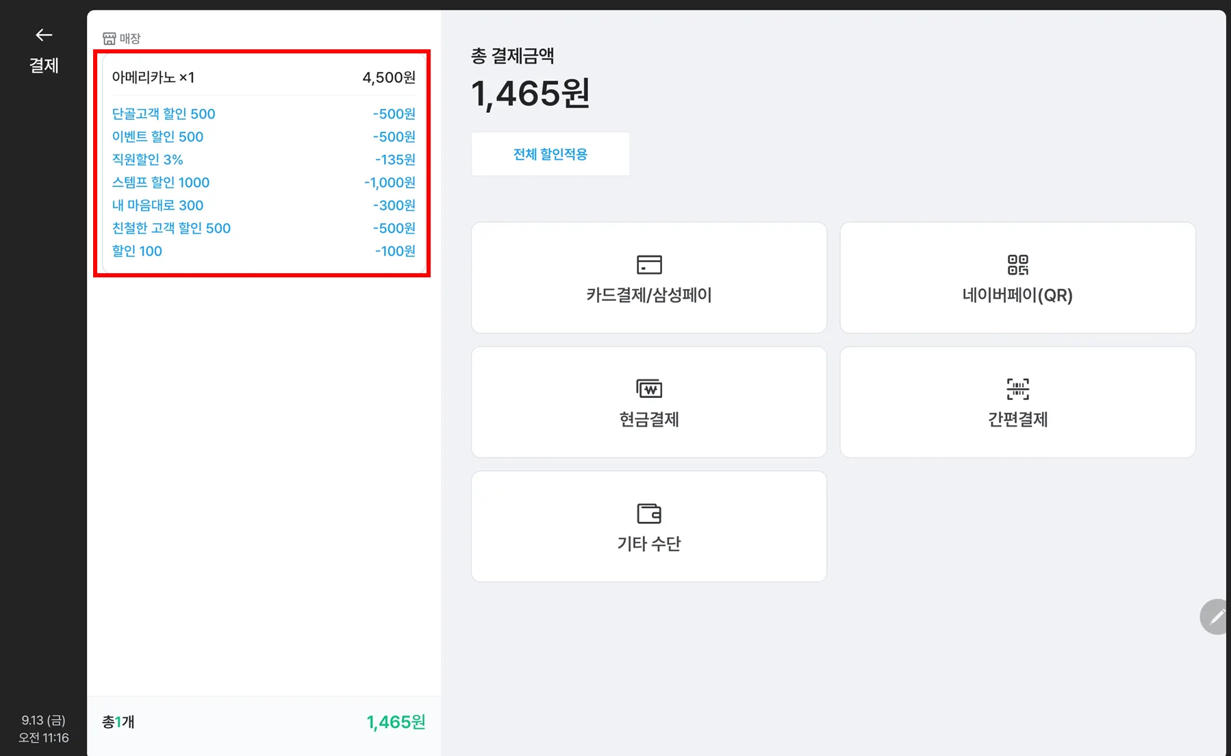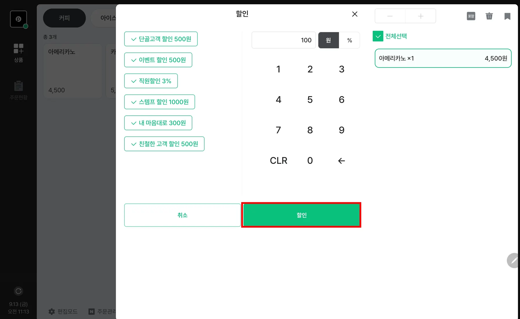 전체할인적용되는 카테고리는 숫자 키패드 포함 최대 4개 를 선택할 수 있어요.