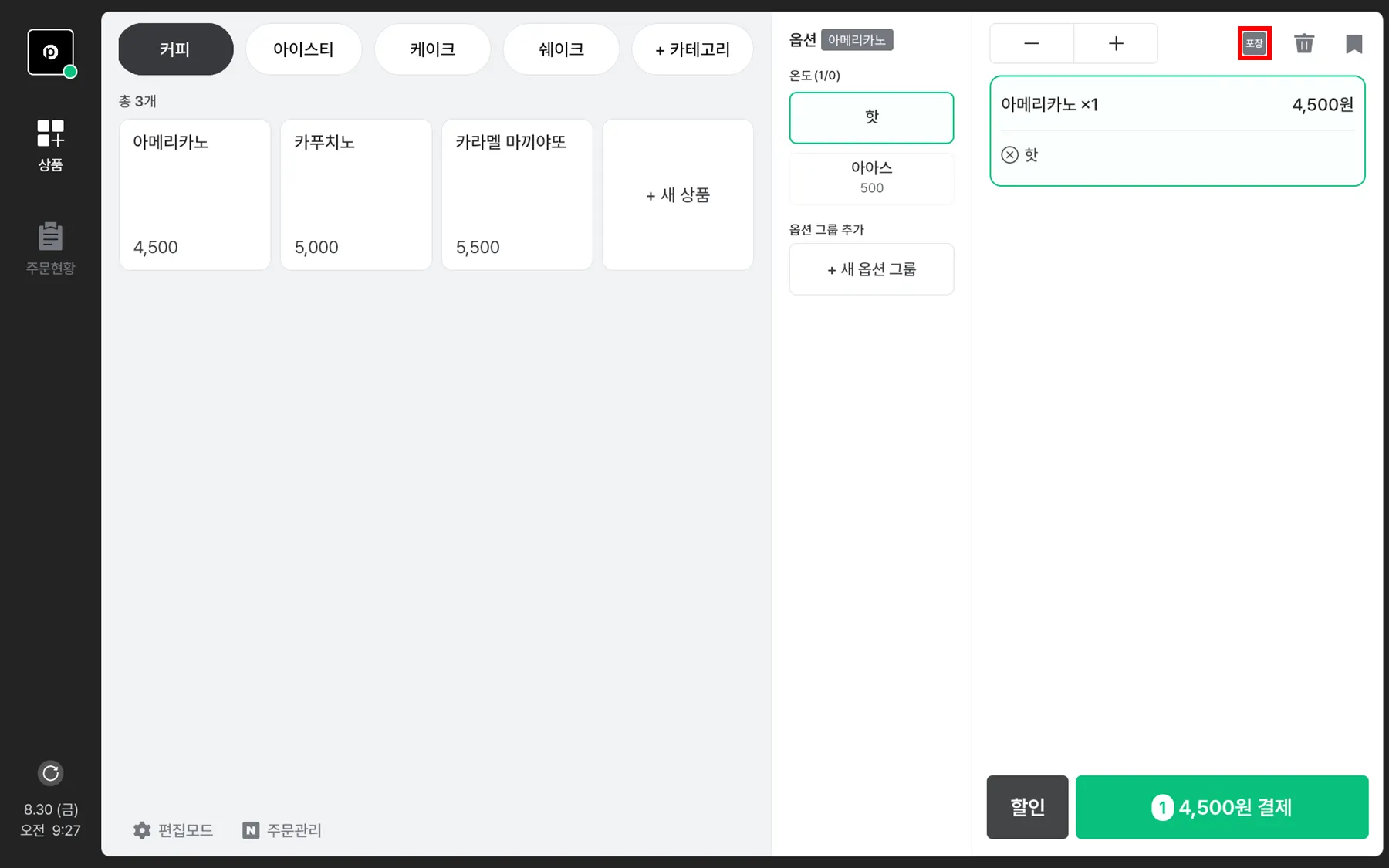 해당 [‘포장’아이콘]을 선택 시 상품을 포장 등록 할 수 있어요.