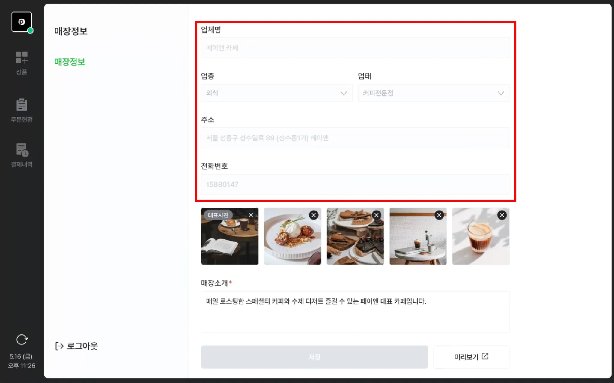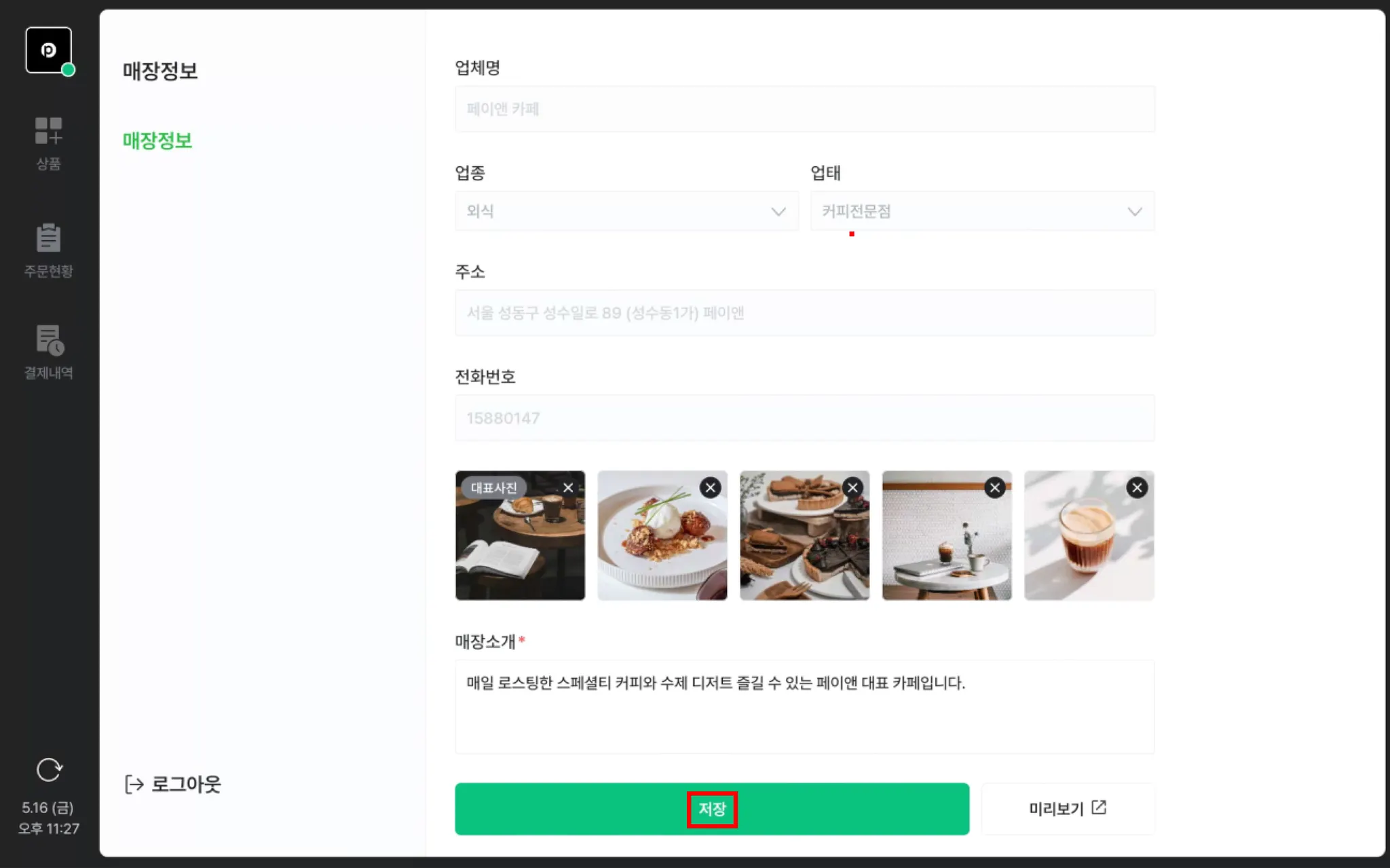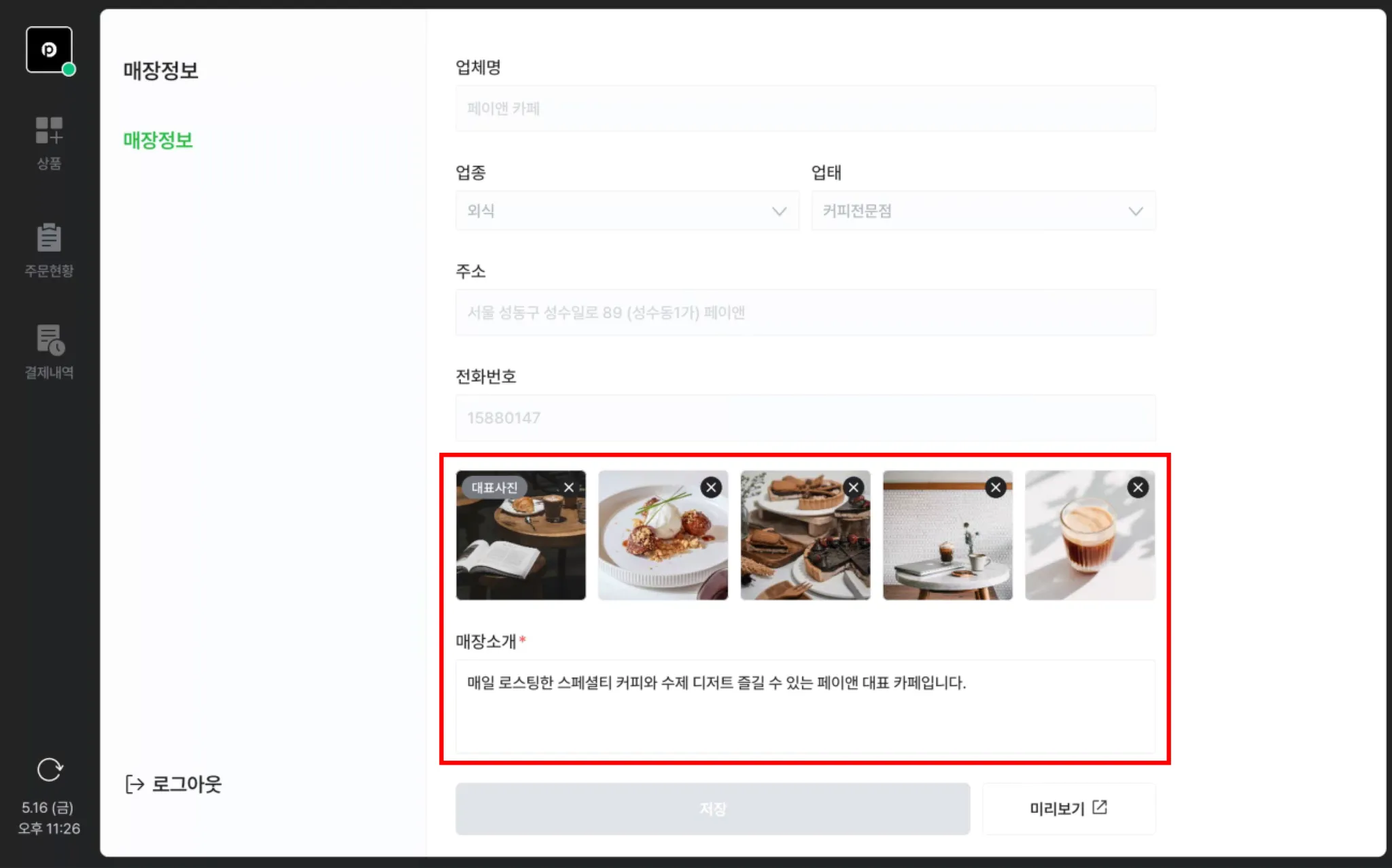 매장사진 및 매장소개를 설정하고 하단 [저장] 버튼을 선택해 주세요.