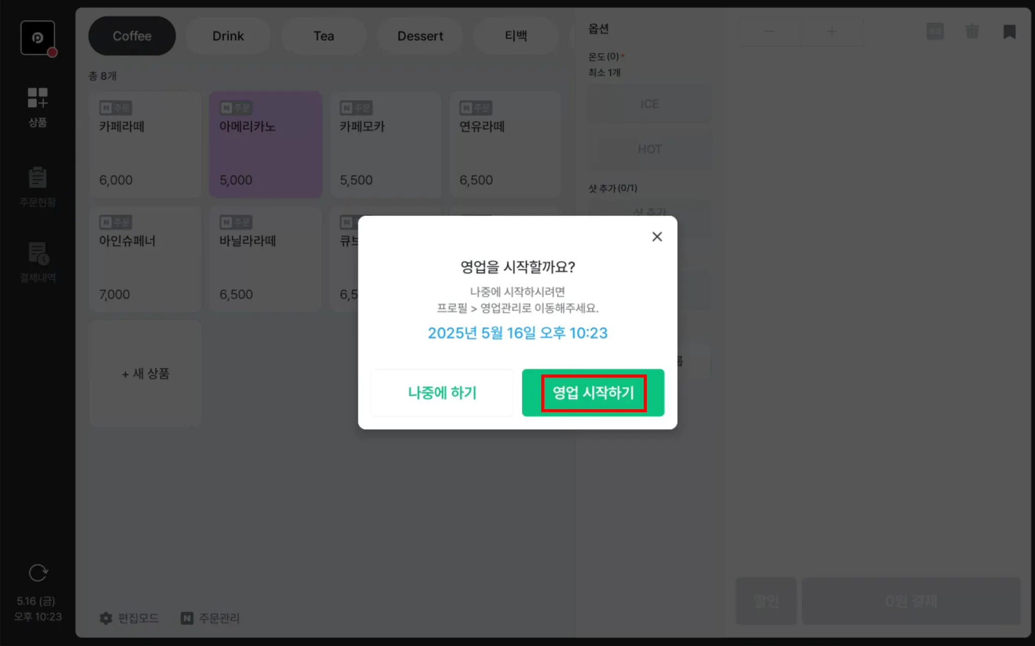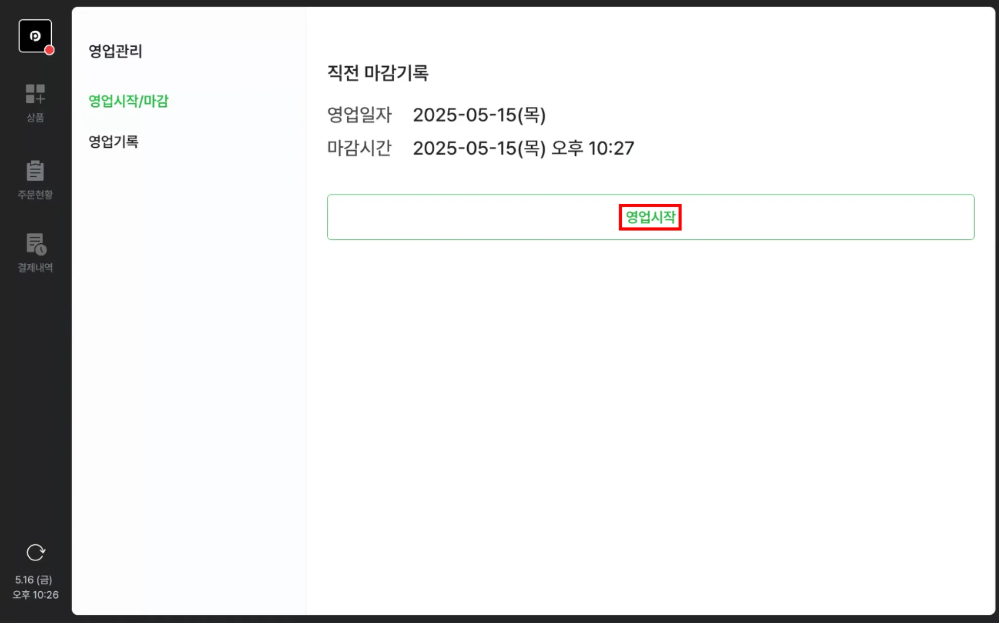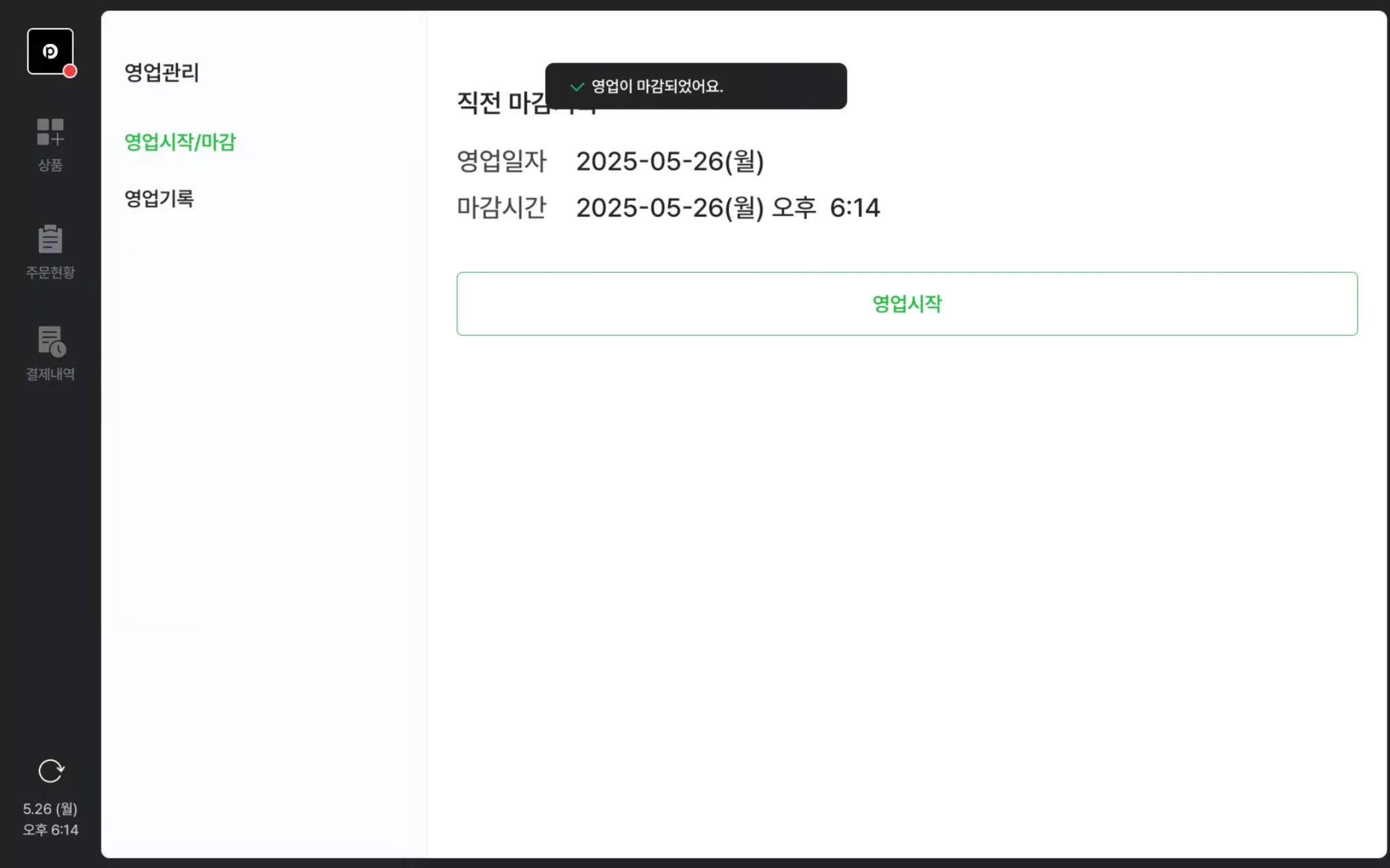 영업 시작하기 버튼을 누르면 영업이 시작됩니다.