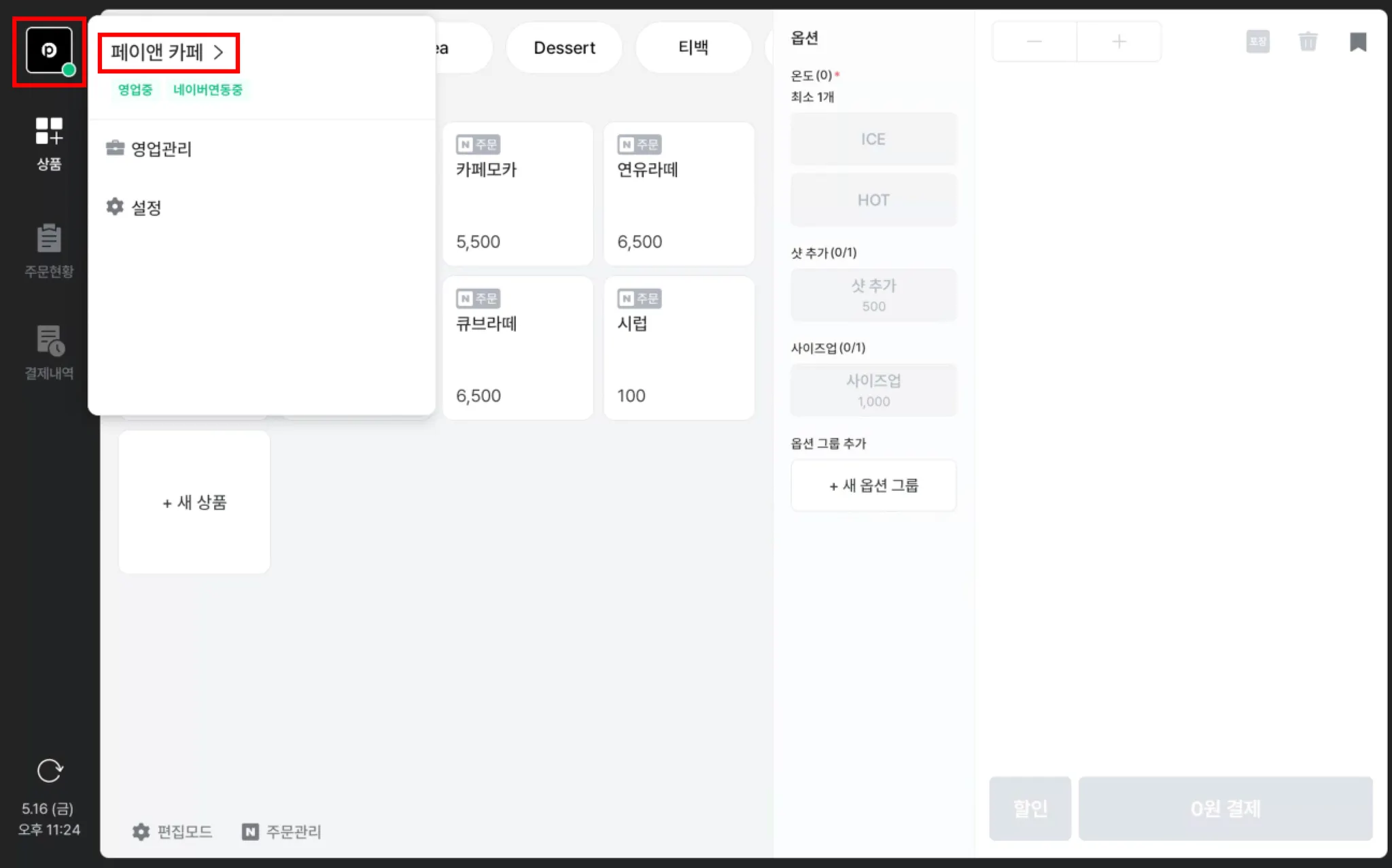 좌측 상단 로고 선택 후 매장명을 선택해 주세요.