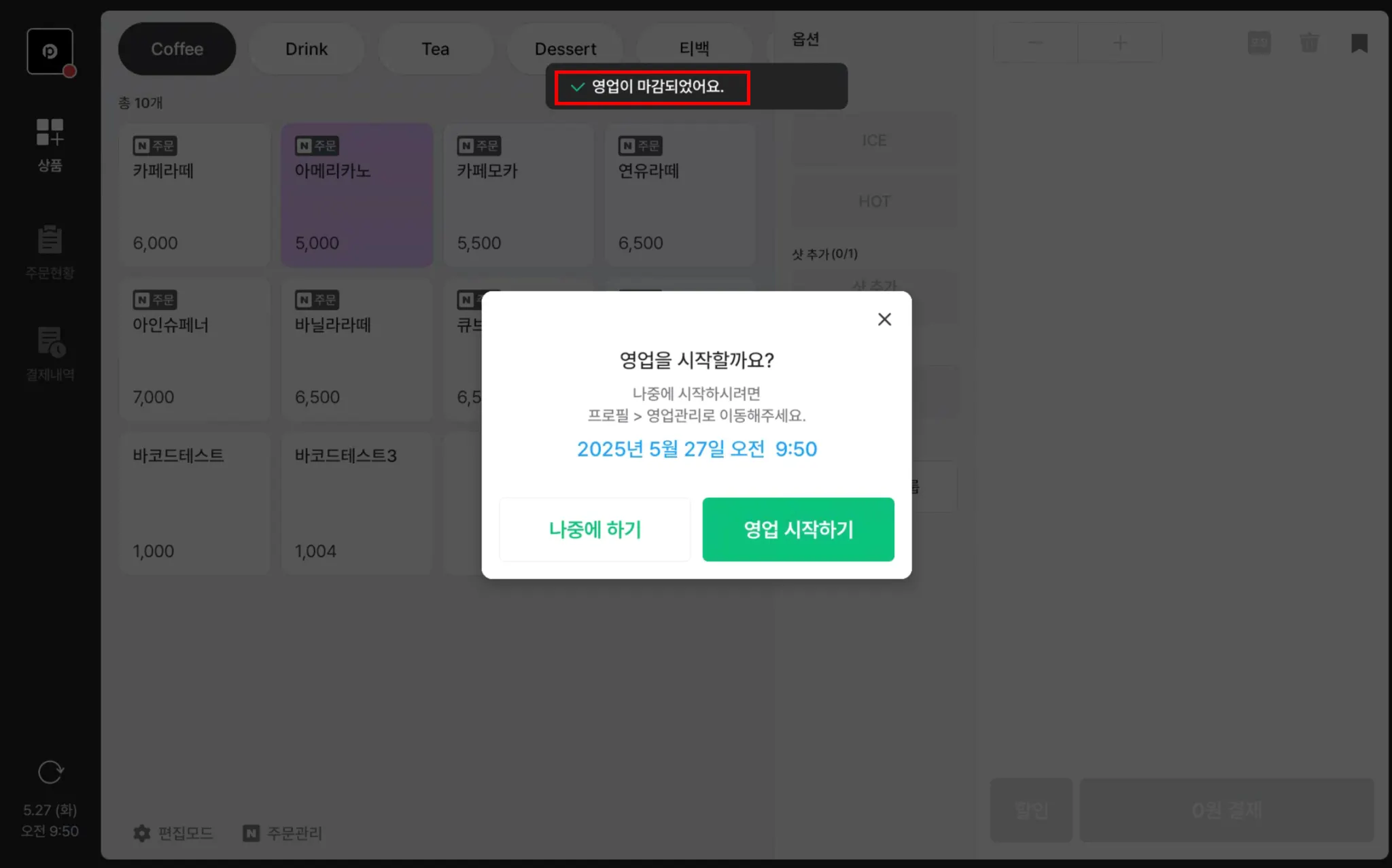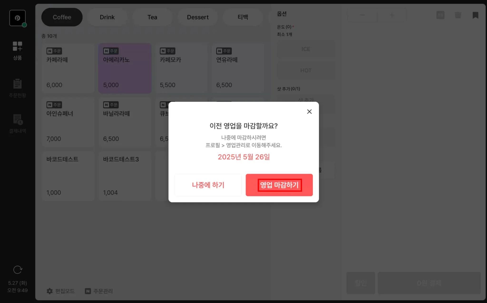 전일 마감하지 않으신 경우 영업 마감 팝업이 떠요. 영업을 마감해주세요.
