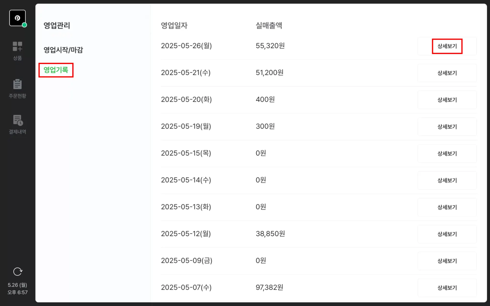 영업 기록 을 선택하고 영업일자에 맞는 상세보기를 클릭해 주세요