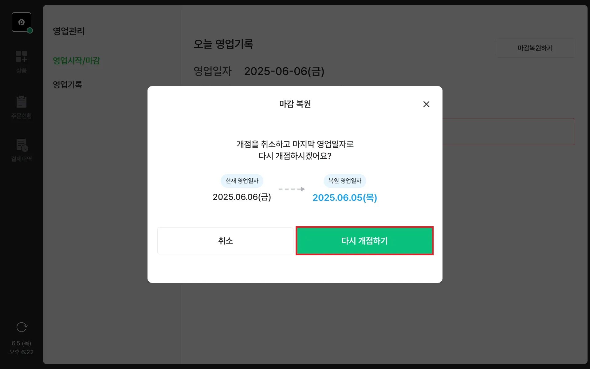 현재 일자와 영업 일자가 맞지 않게 개점하는 경우 마감을 복원하는 기능이에요.