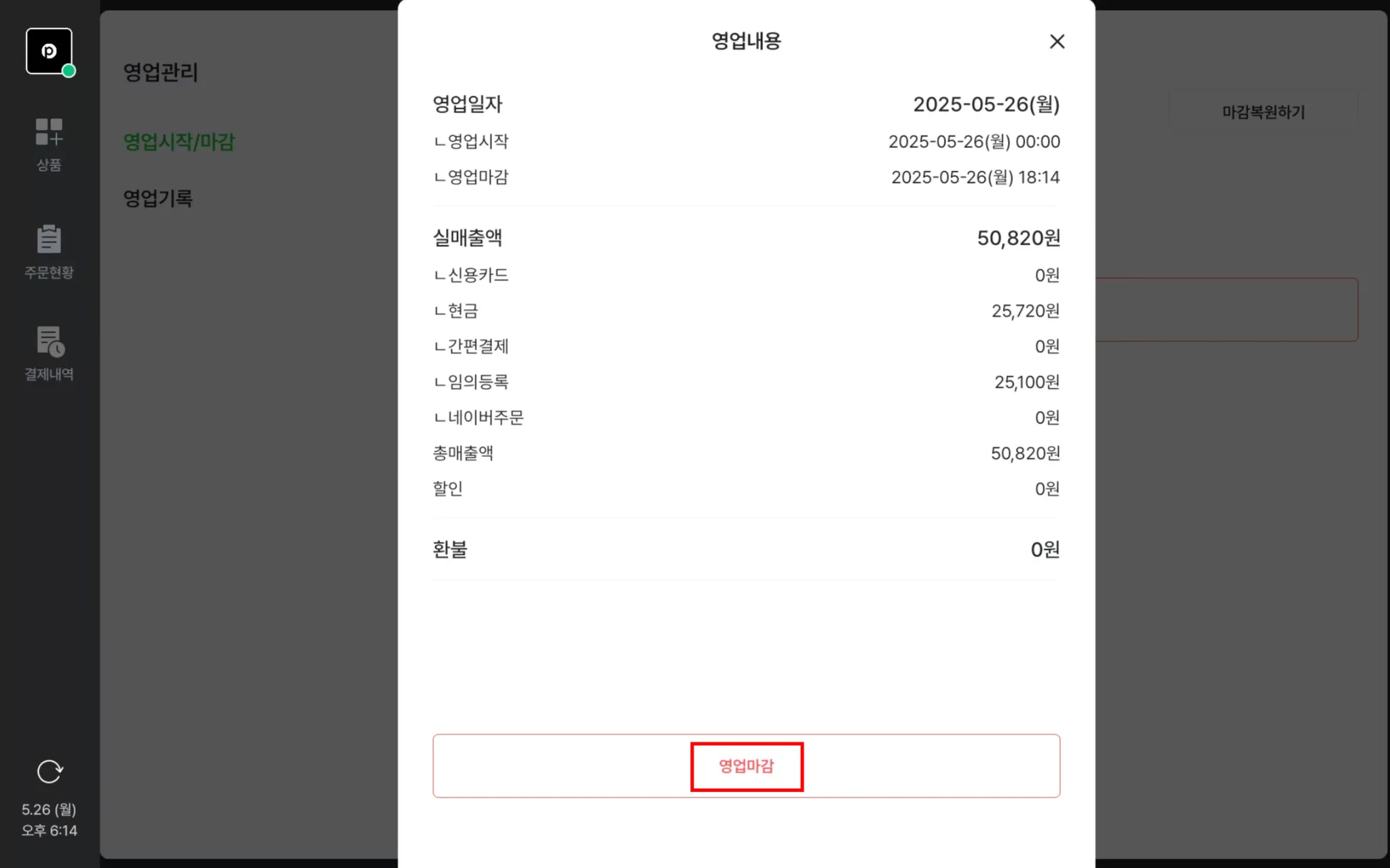 상세 영업 내용 팝업이 뜨면 하단 영업 마감 버튼을 선택해 주세요.