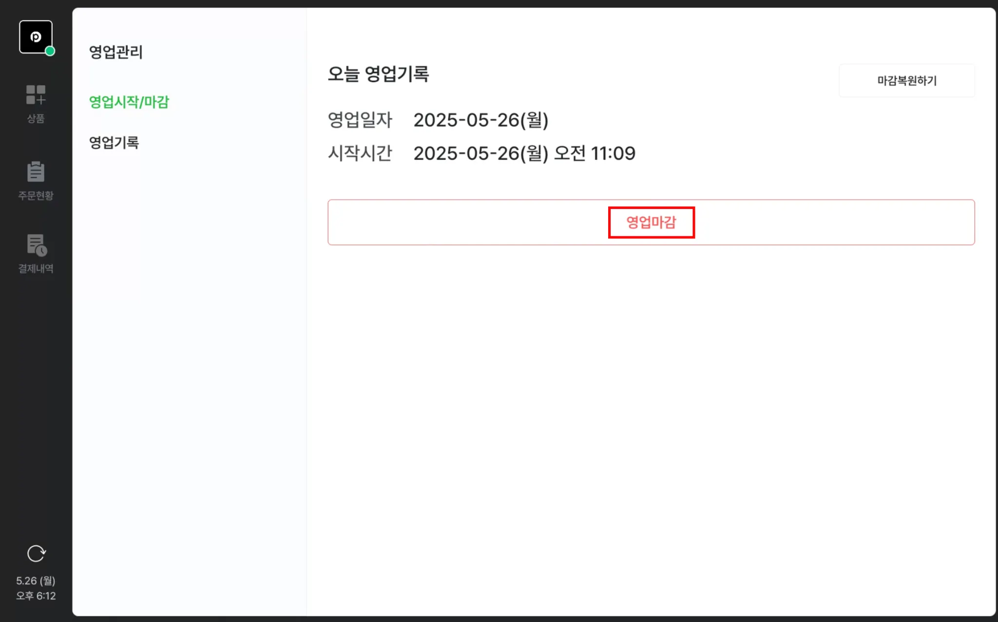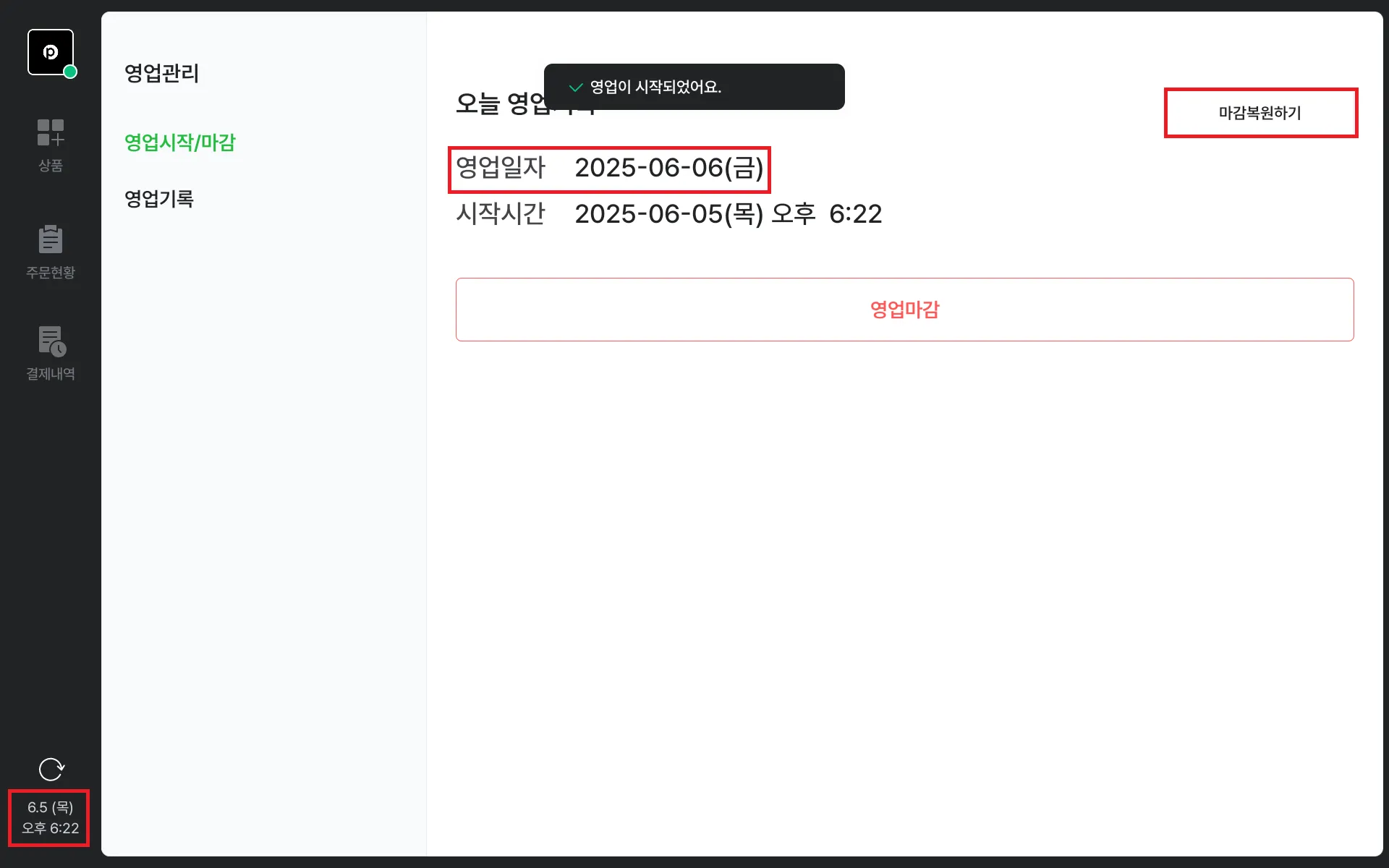 미래 영업일로 개점한 경우 마감 복원하기를 클릭해주세요.