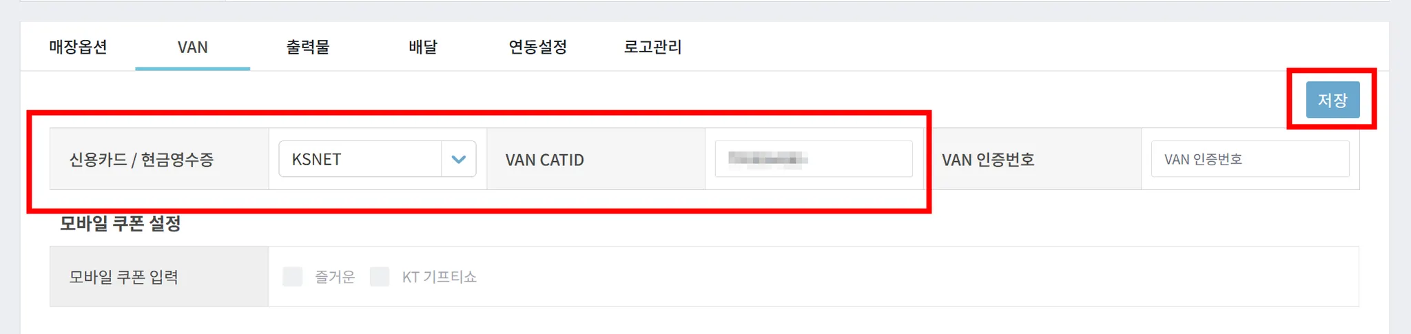 모집인페이지 > 매장환경설정 > 옵션설정 > VAN > 신용카드/현금영수증 > KSNET > VAN CATID 입력 > 저장