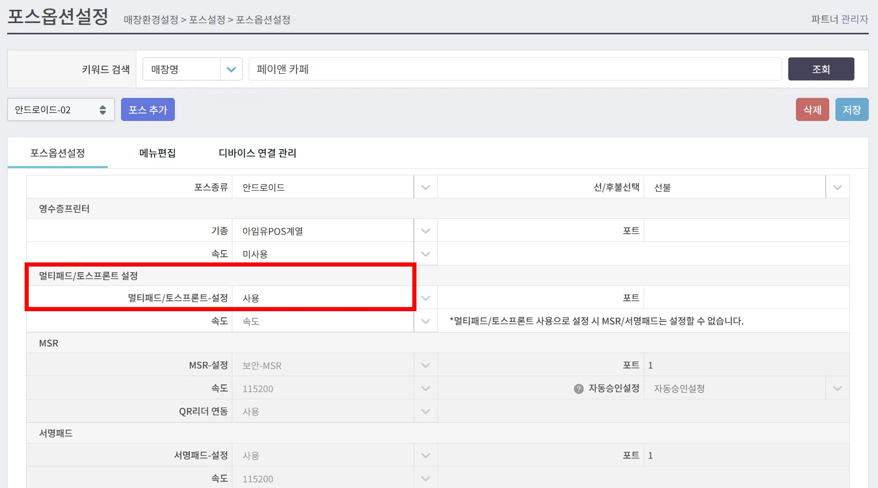 모집인페이지 > 매장환경설정 > 포스설정 > 포스옵션설정 > 멀티패드/토스프론트 설정 > 멀티패드/토스프론트-설정 사용 > 저장