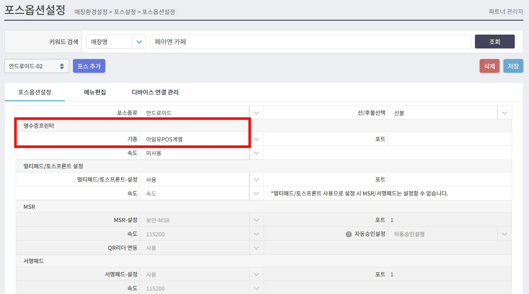 모집인페이지 > 매장환경설정 > 포스설정 > 포스옵션설정 > 영수증프린터 > 기종 아임유POS계열 > 저장