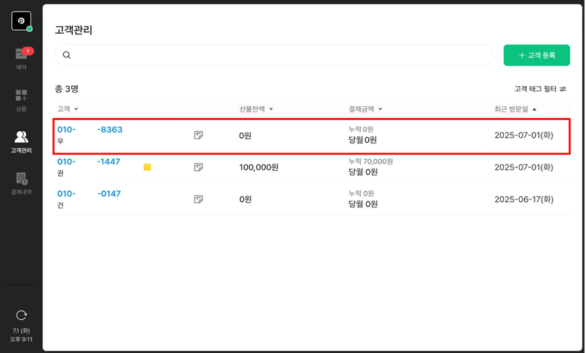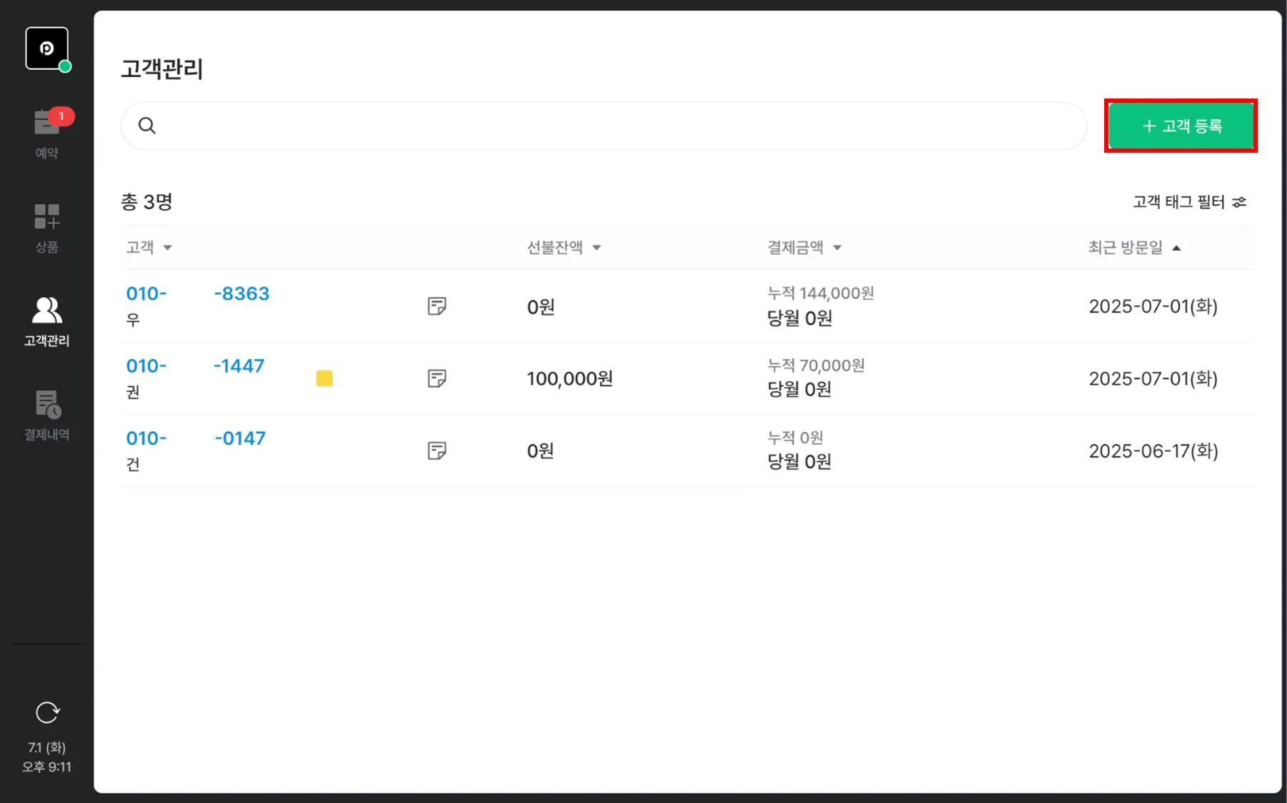 고객 관리 탭의 고객 등록을 클릭해주세요.