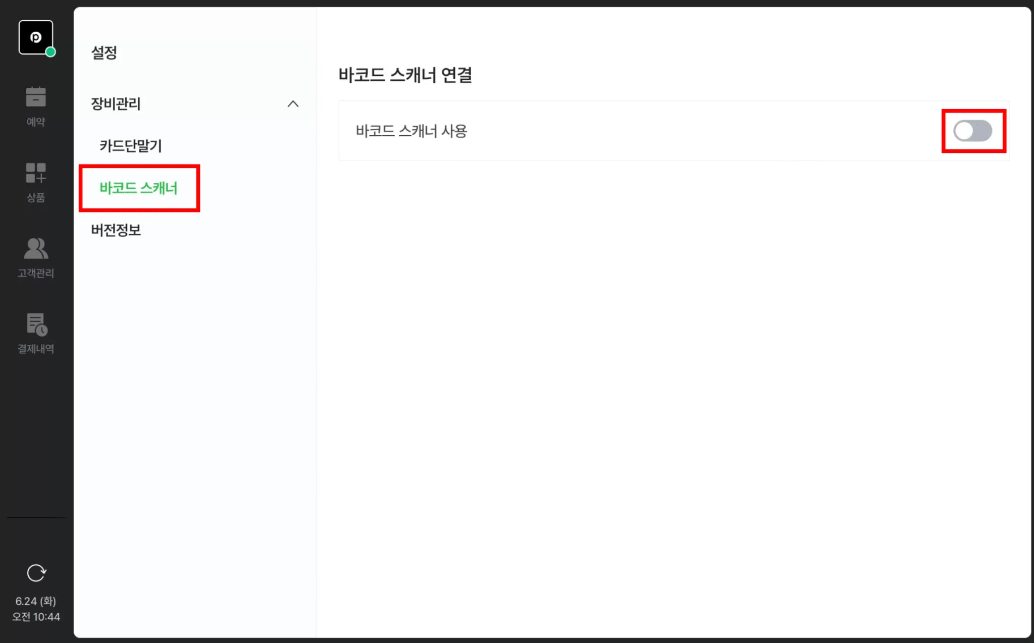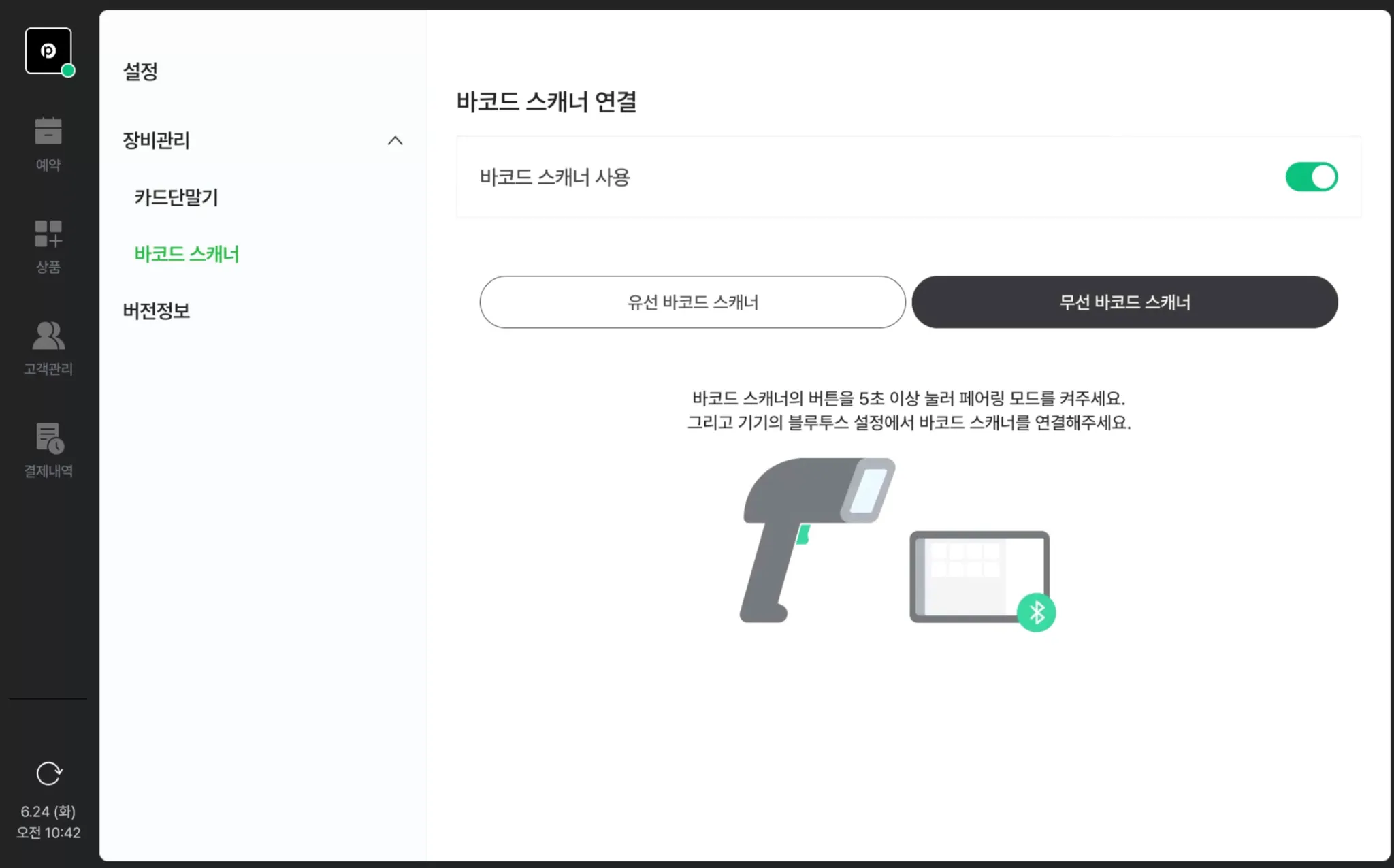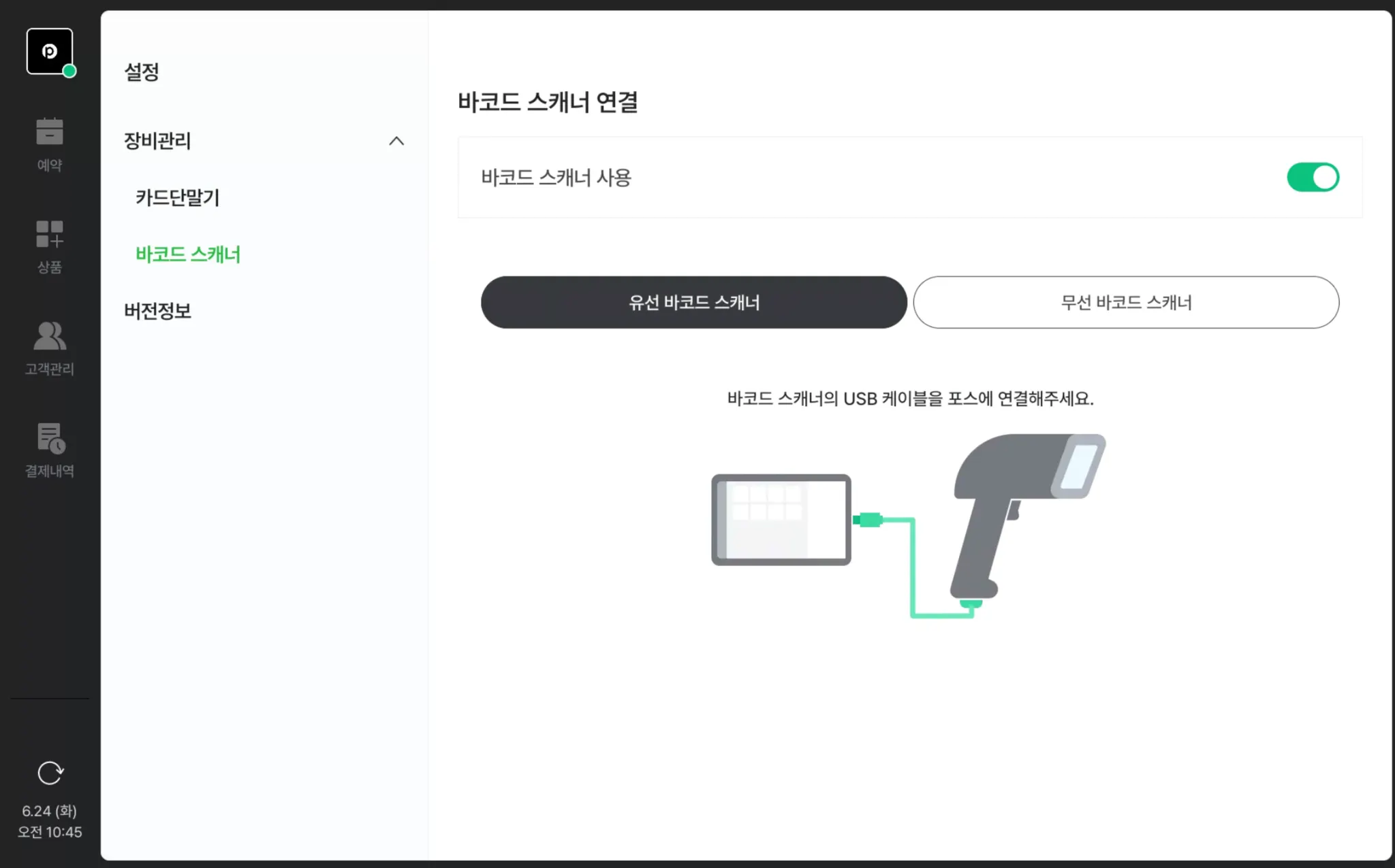 바코드 스캐너를 선택한 뒤, 사용 버튼을 활성화해 연결해 주세요.