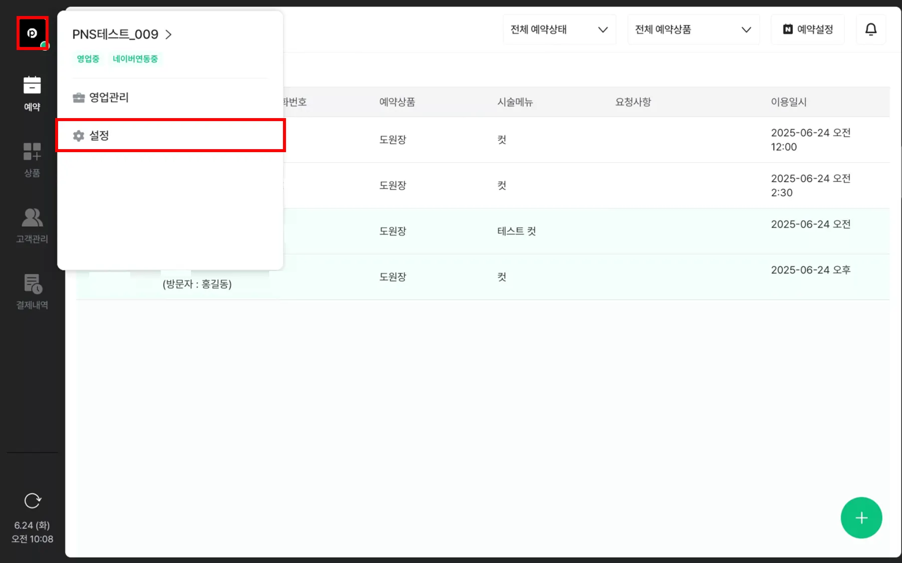 좌측 상단 로고 > 설정을 선택해 주세요.