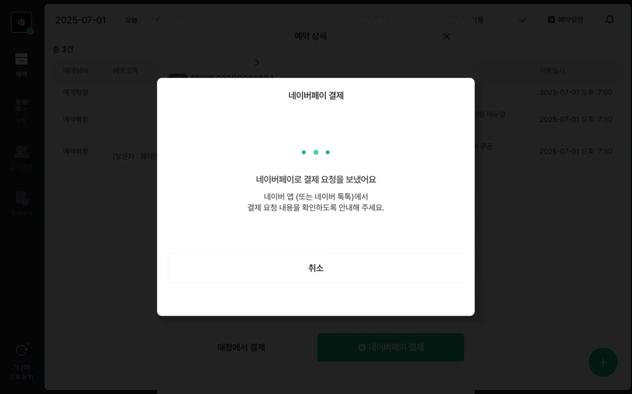 결제 요청을 다시 보내려면 취소 후 네이버페이 결제를 다시 선택해주세요.