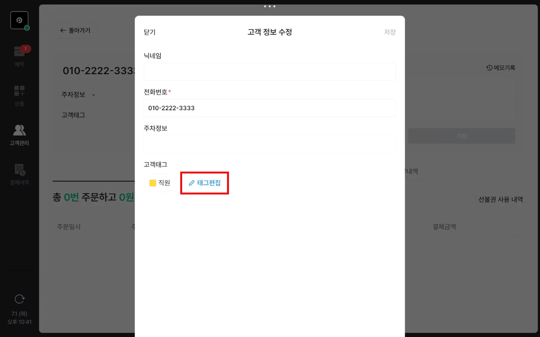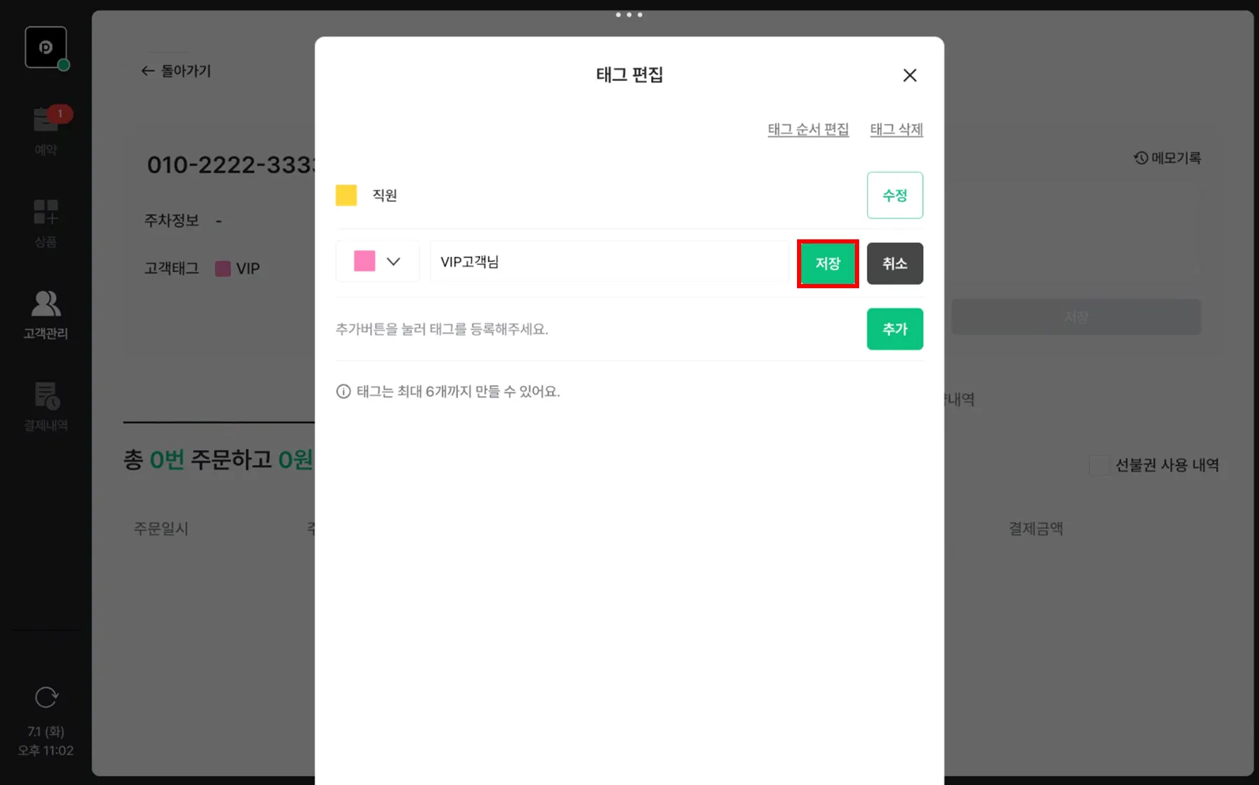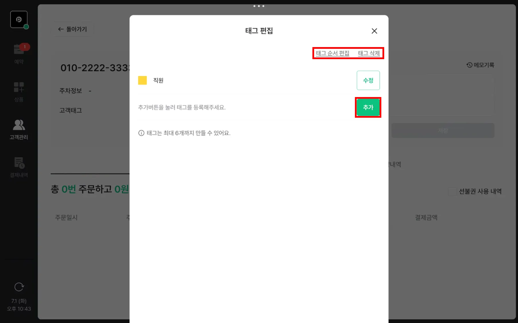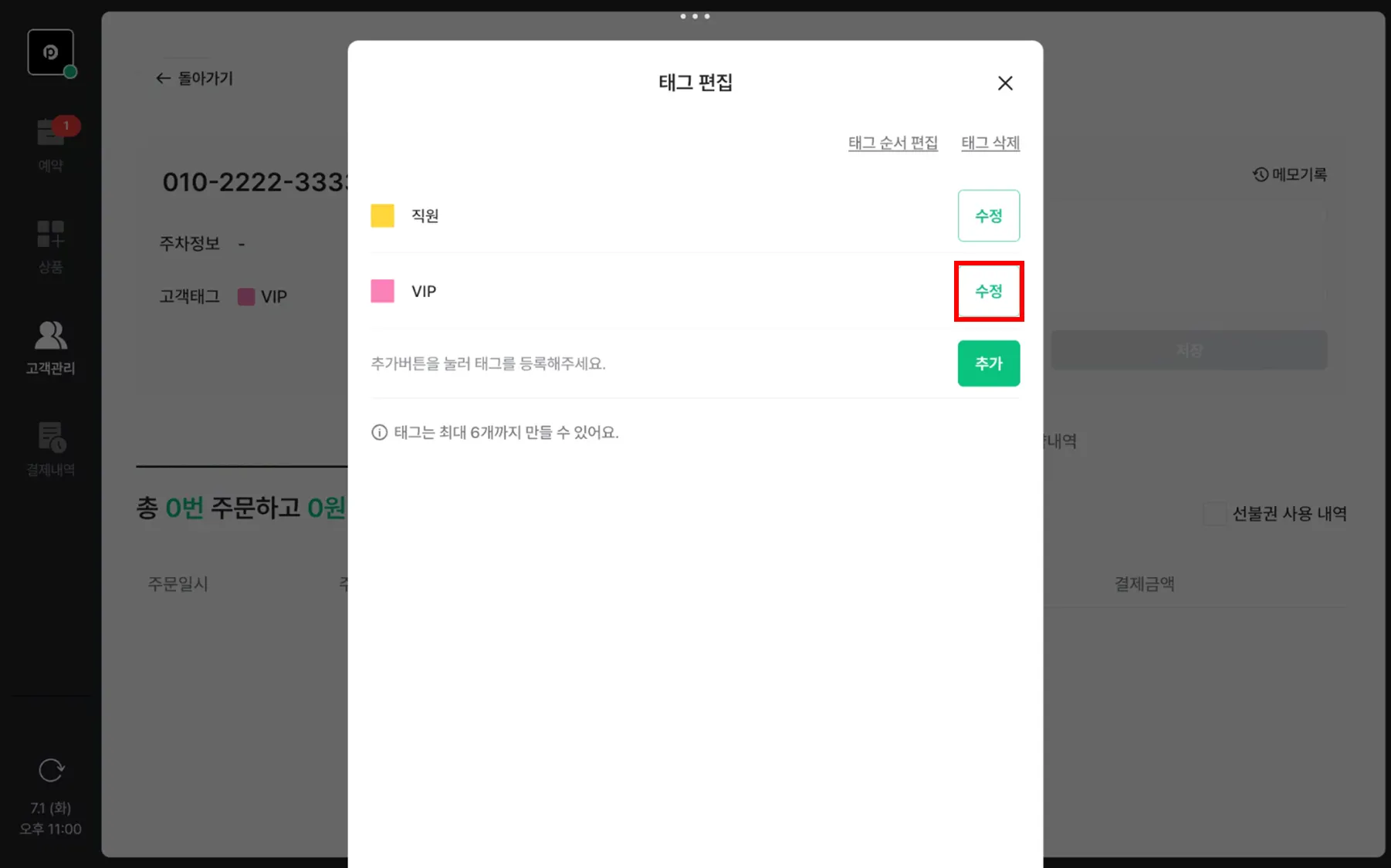고객태그 > 태그편집에서 태그 추가/수정/순서 편집을 할 수 있어요.