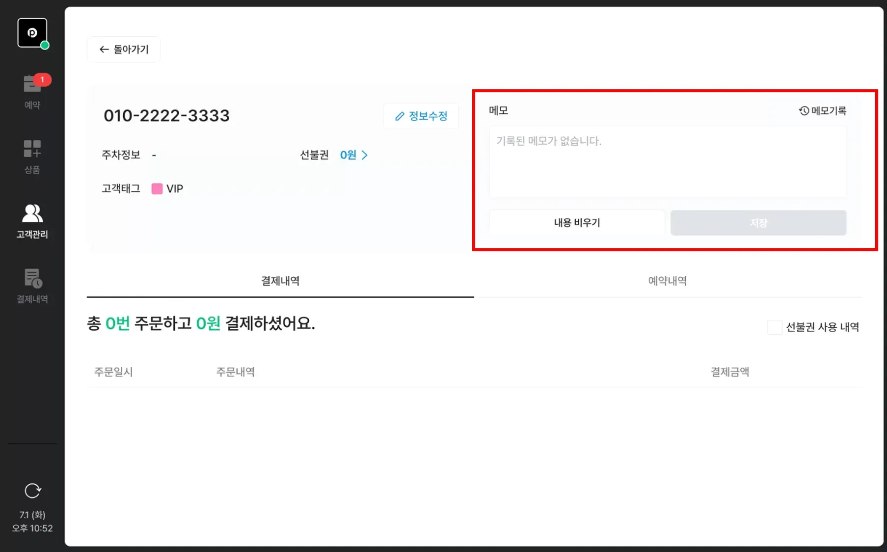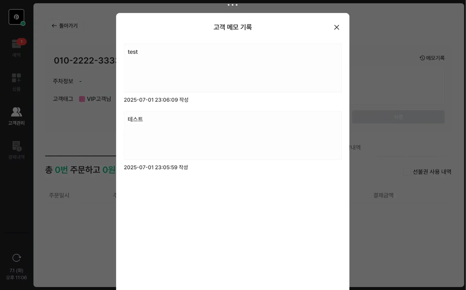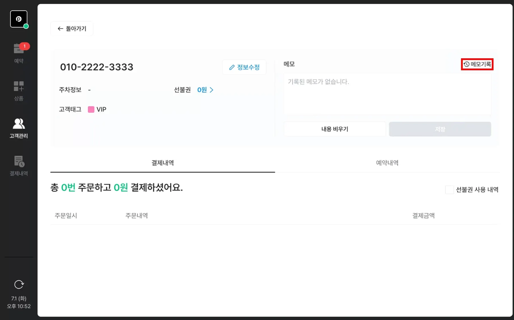 메모기록을 클릭하면 히스토리 확인이 가능해요.