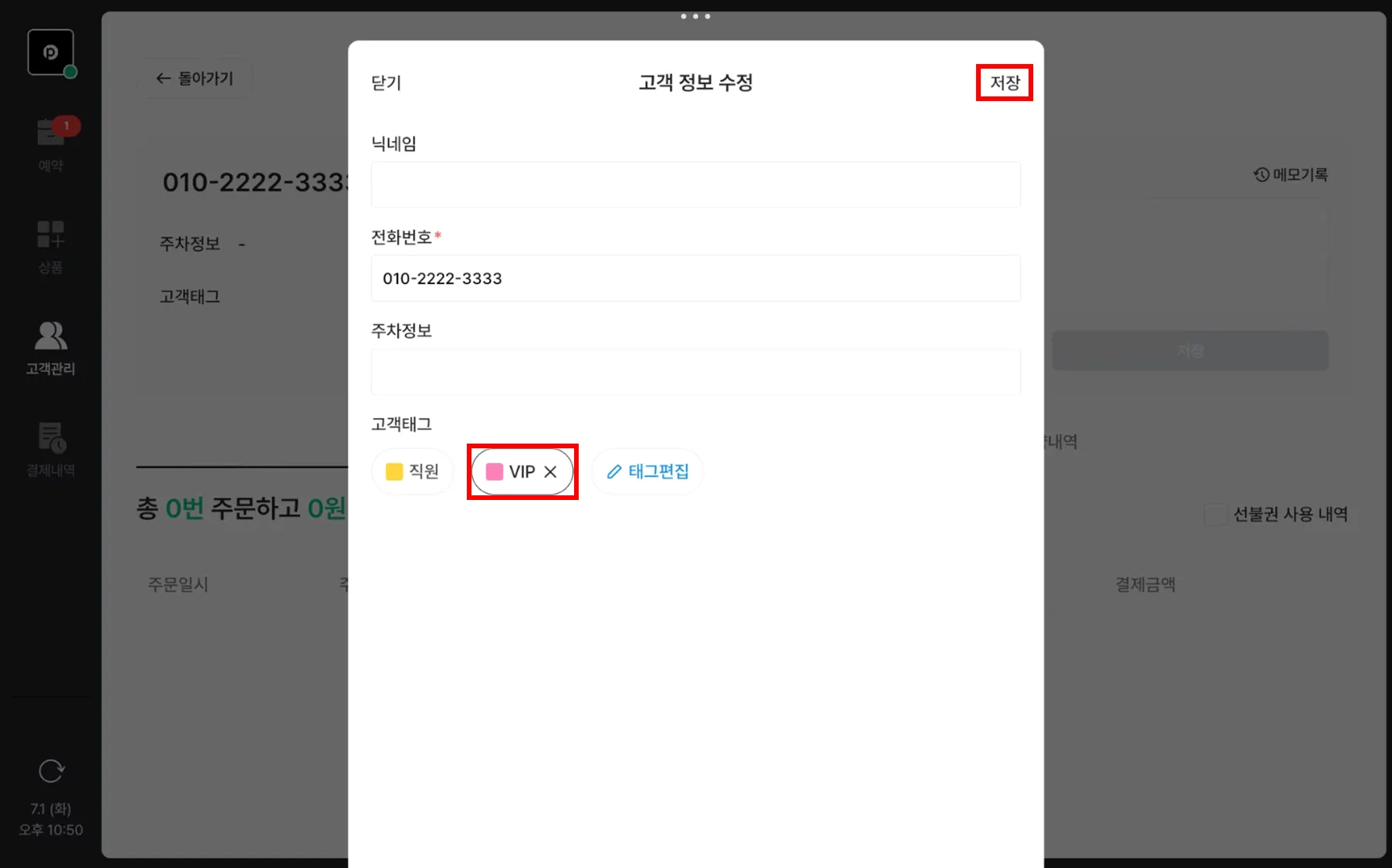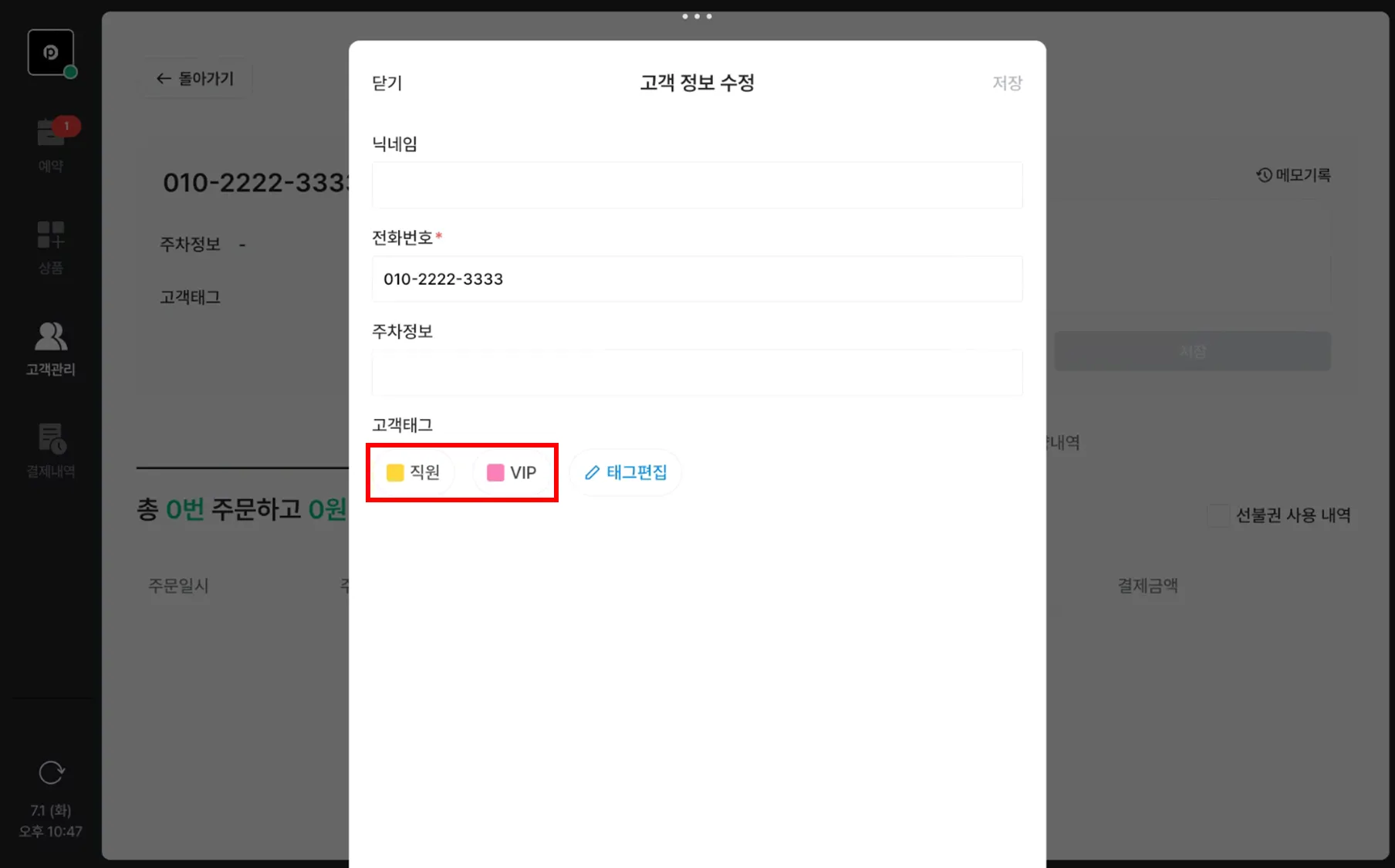 고객 태그를 선택 후 저장을 클릭해 주세요.