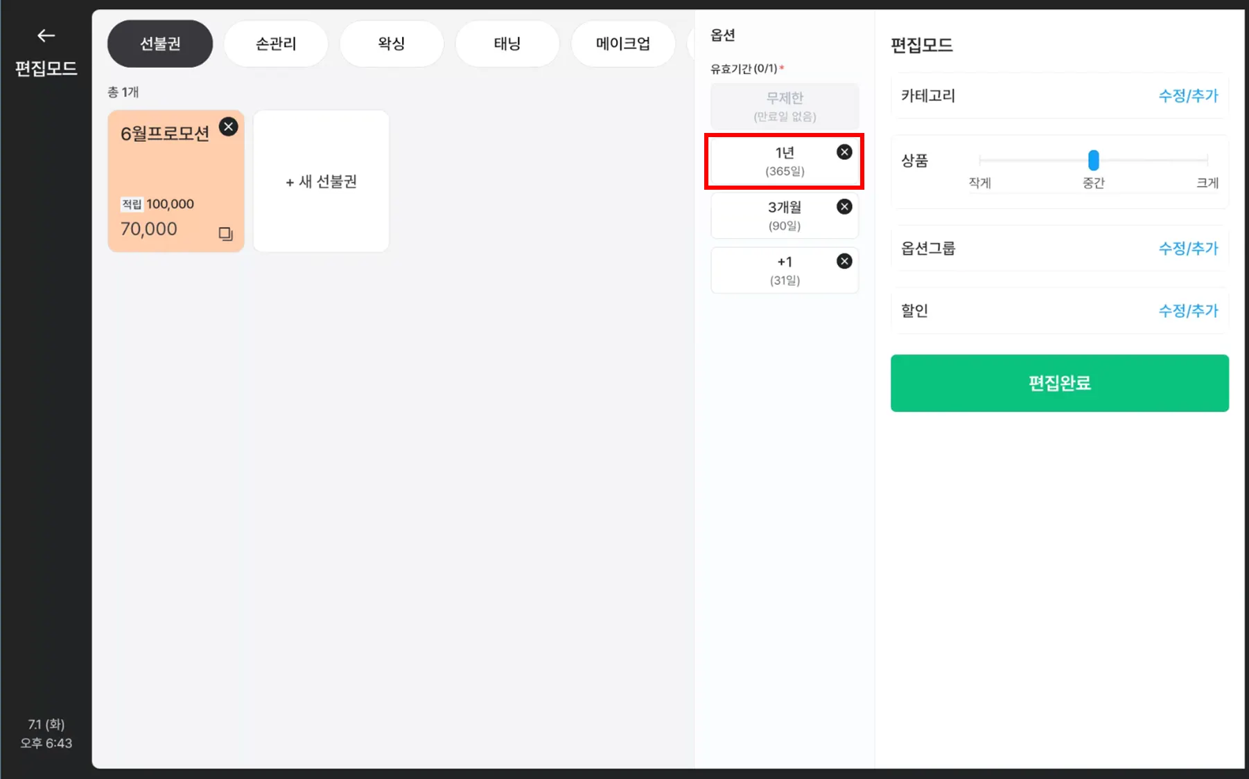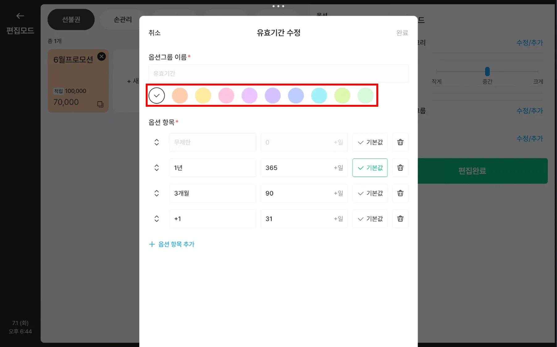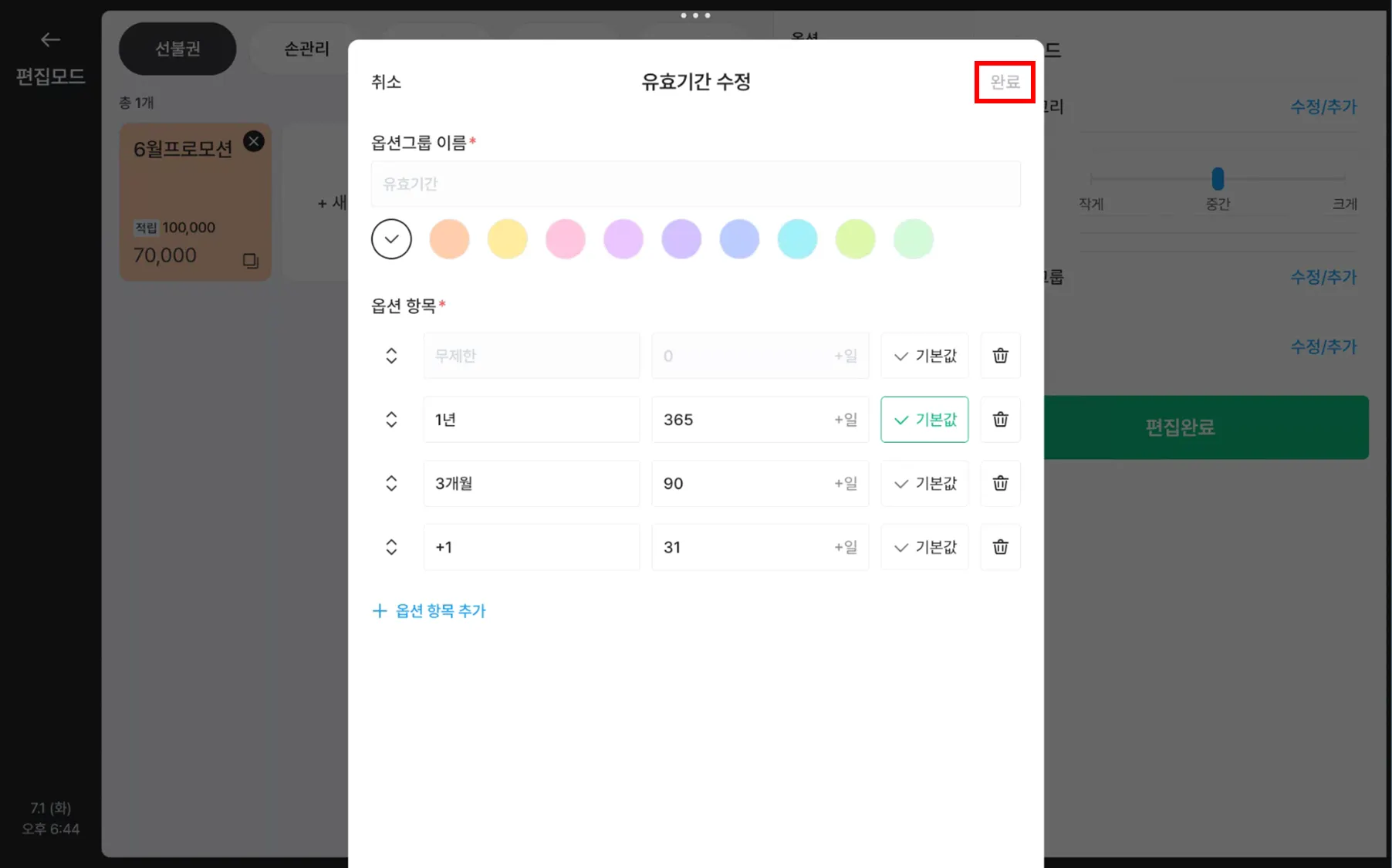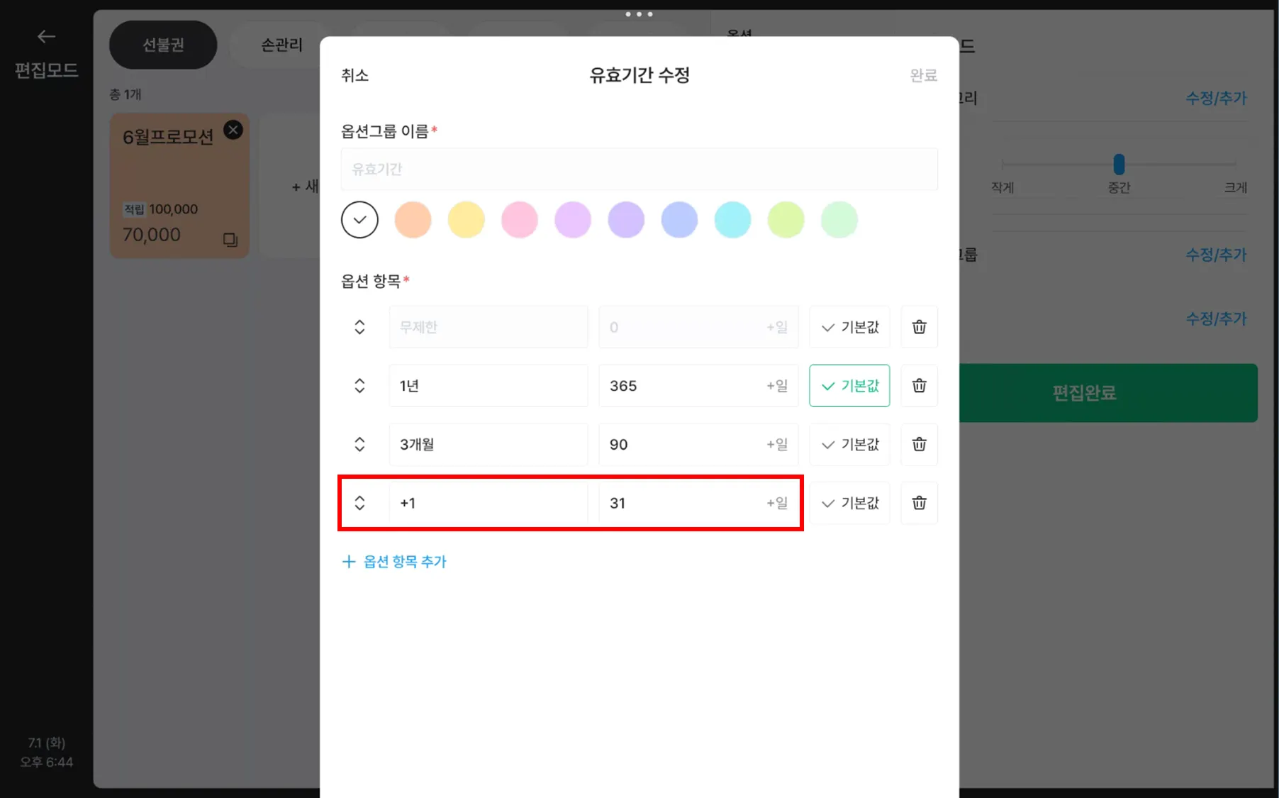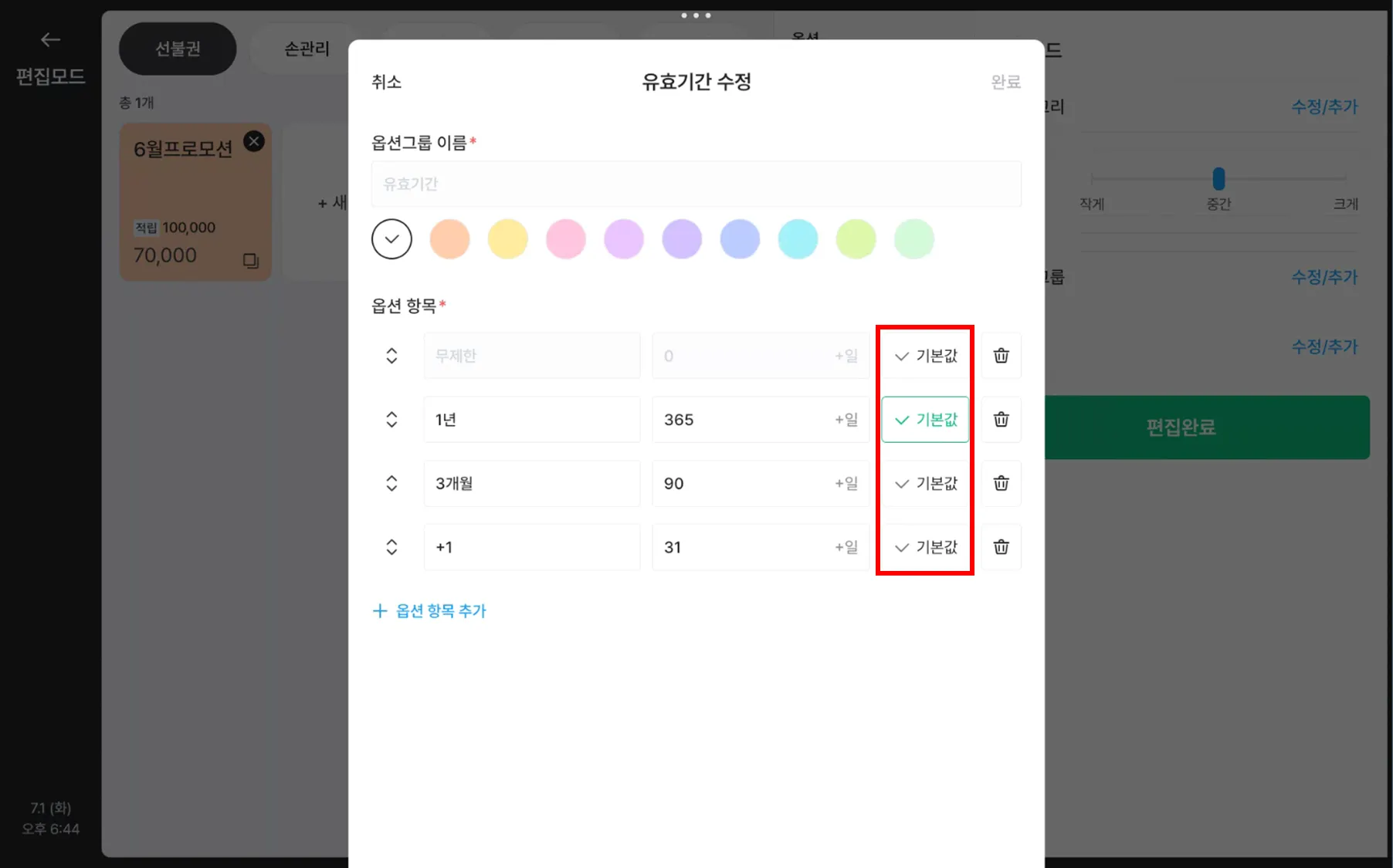 편집 모드 > 유효기간 항목을 선택해 주세요.