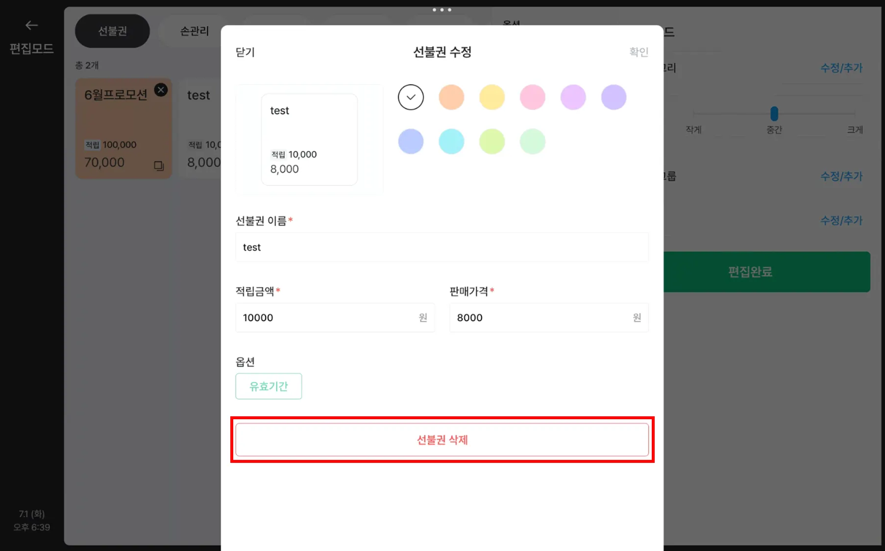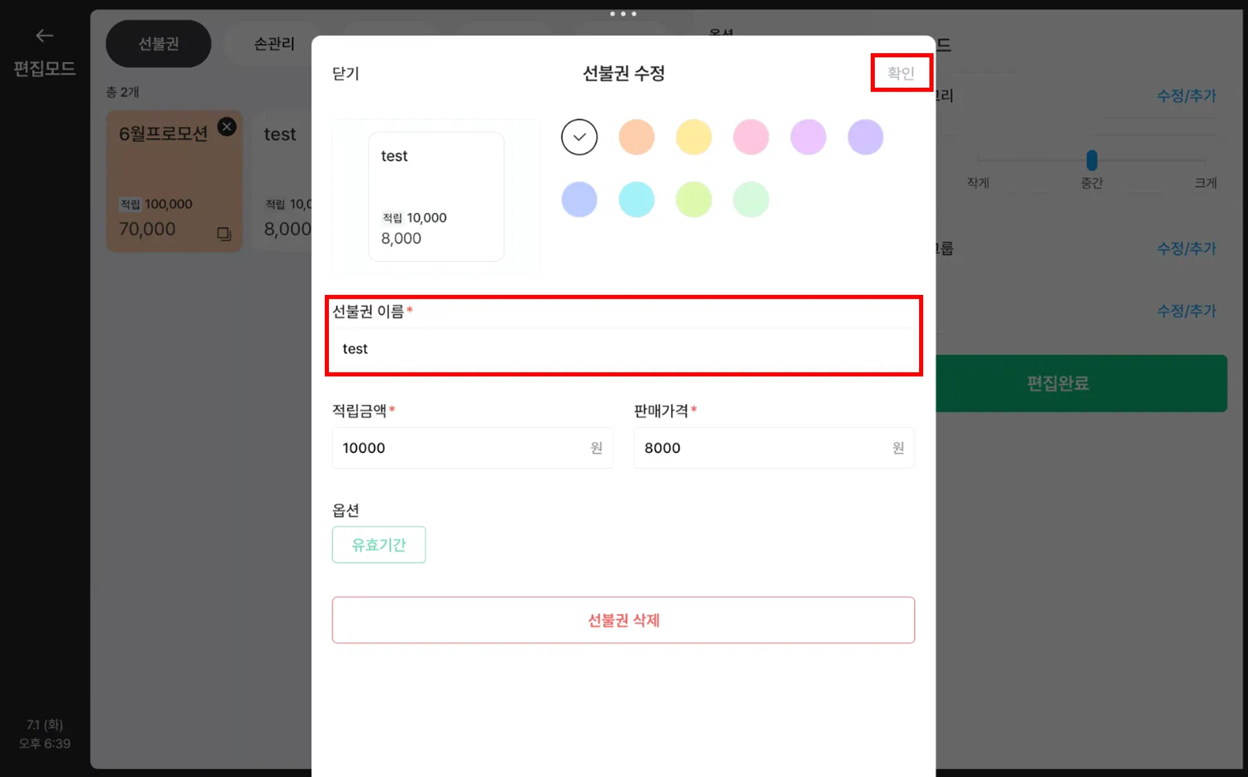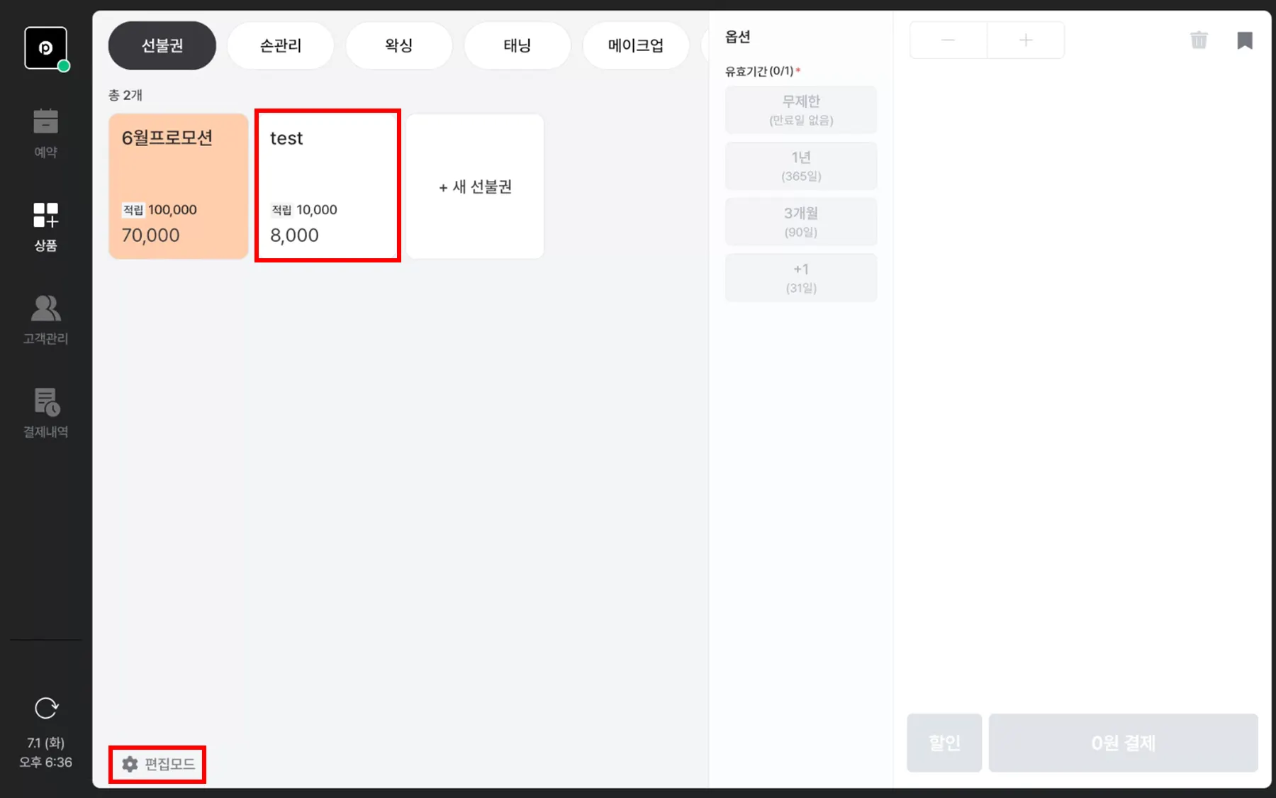 편집 모드를 클릭하고 수정할 선불권을 선택해 주세요.