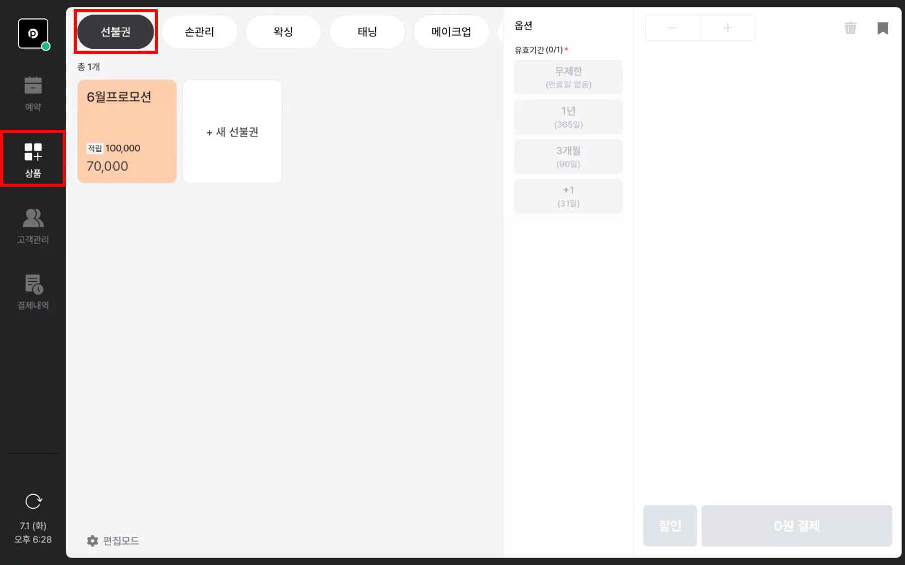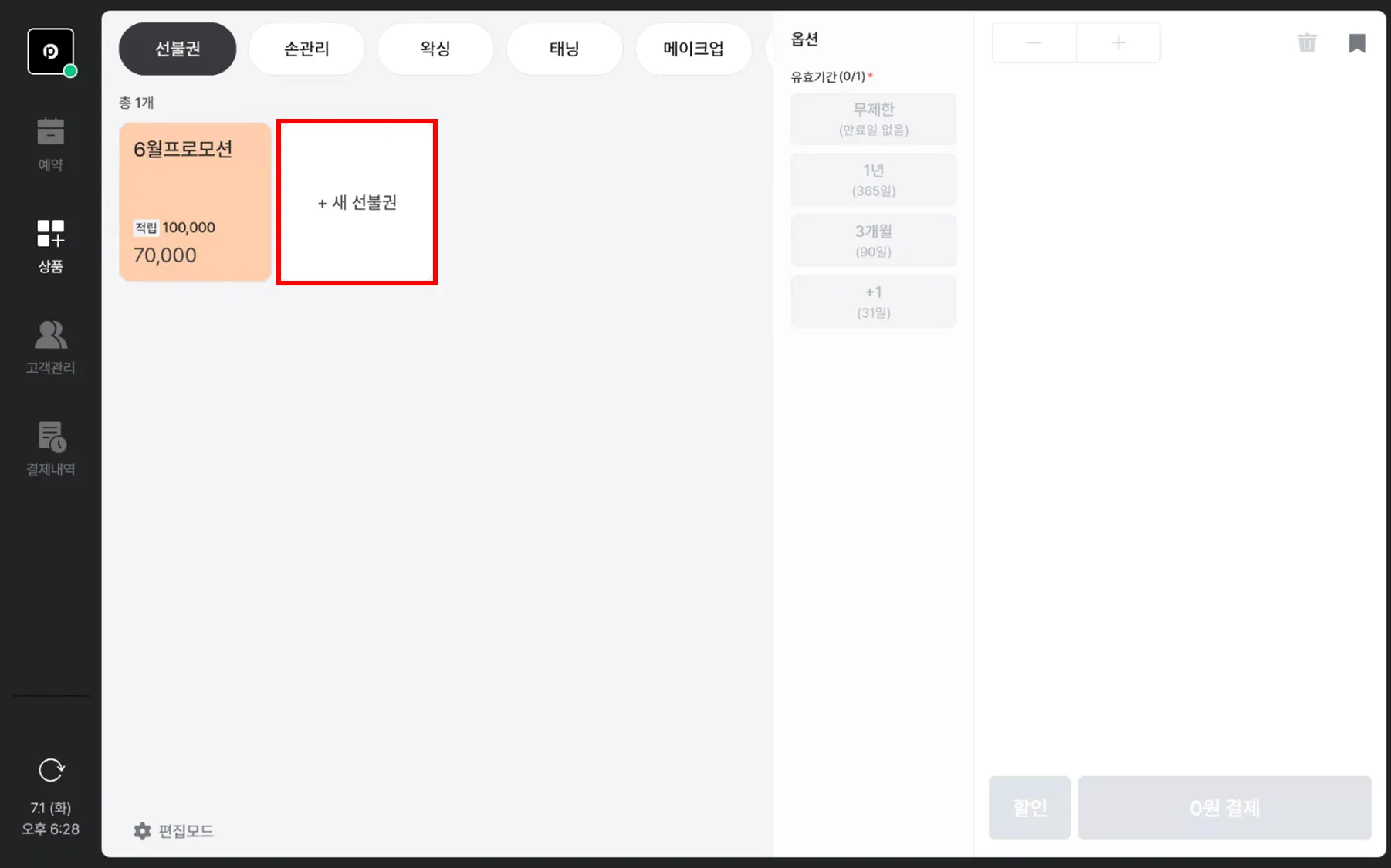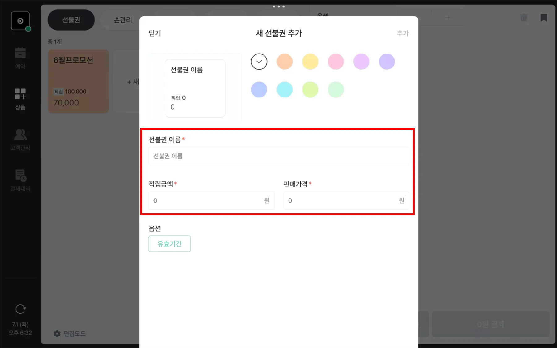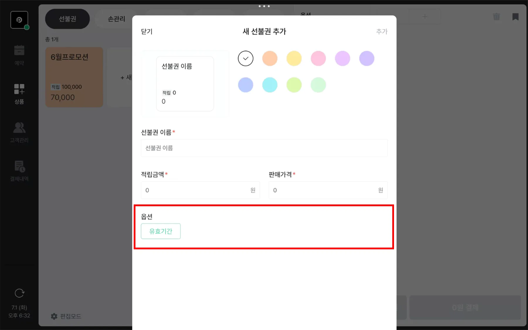 옵션은 유효기간이 필수에요. 선불권을 판매할 때 유효기간을 정할 수 있어요.