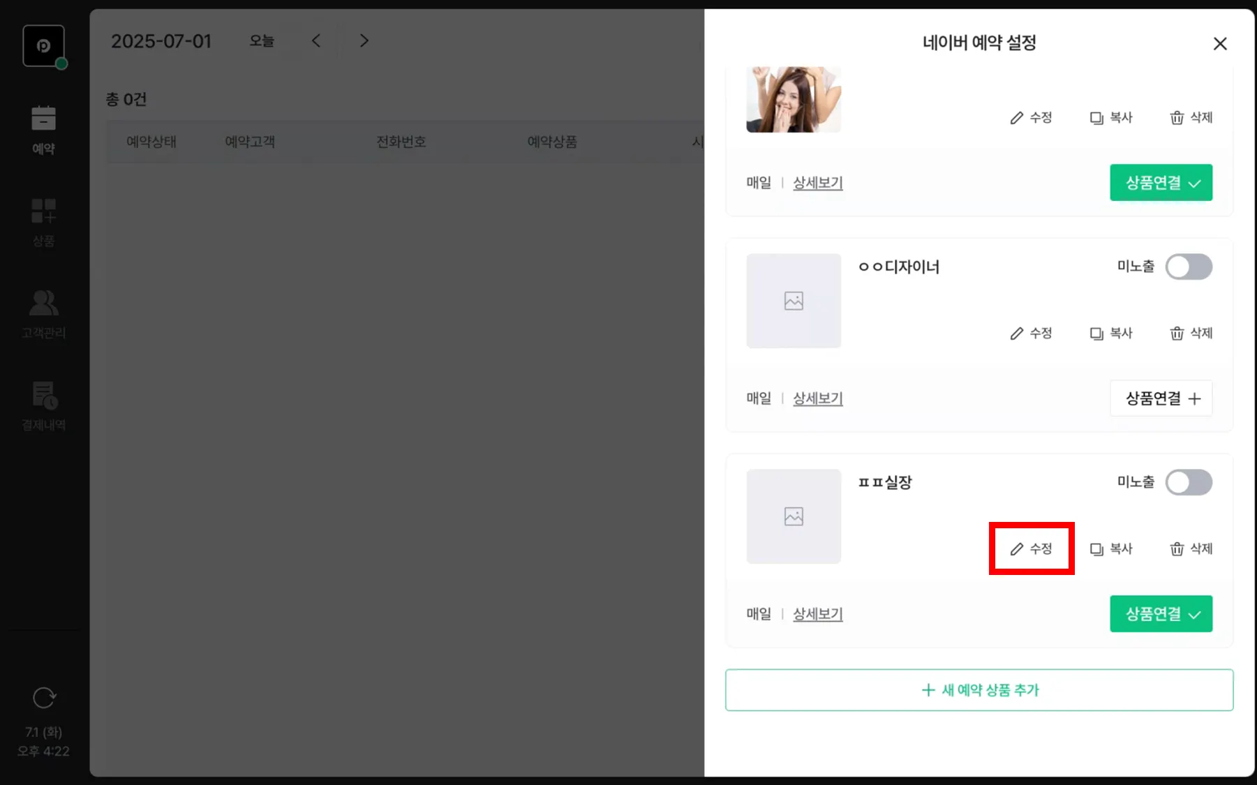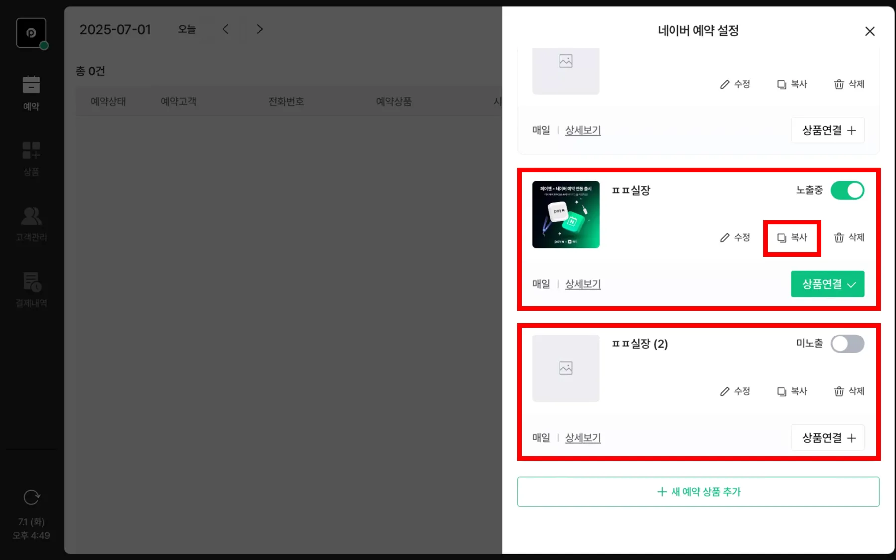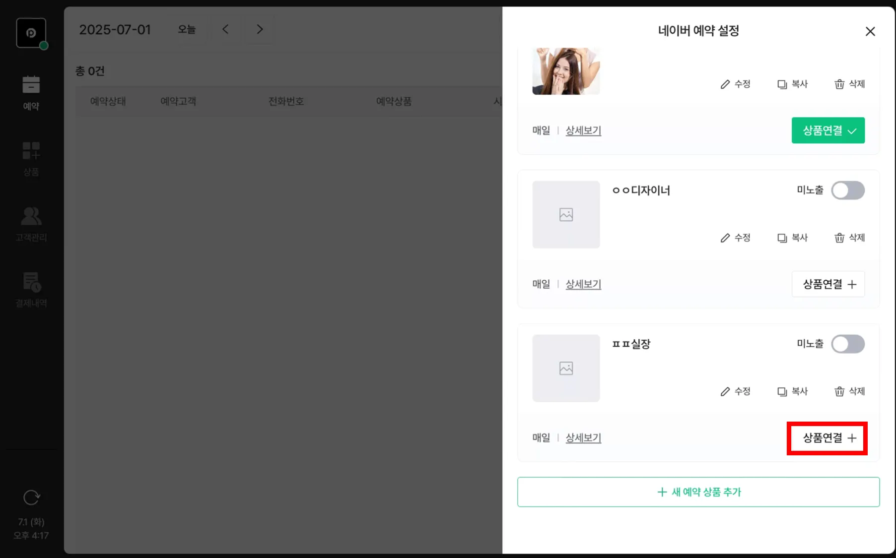 생성된 예약 상품의 상품 연결을 클릭하여 포스 상품을 연결해주세요.