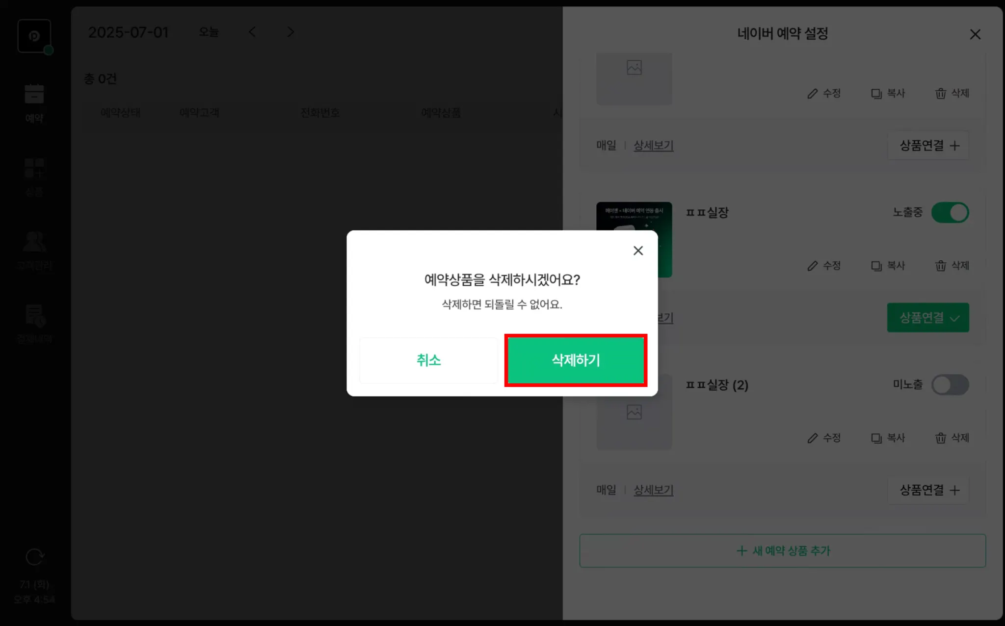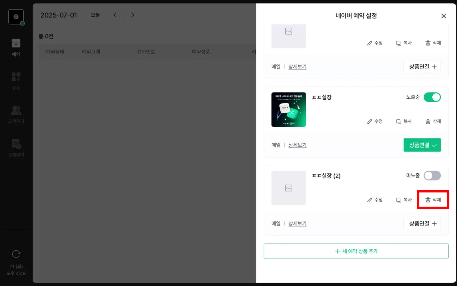 생성되어있는 상품의 삭제를 클릭해주세요.