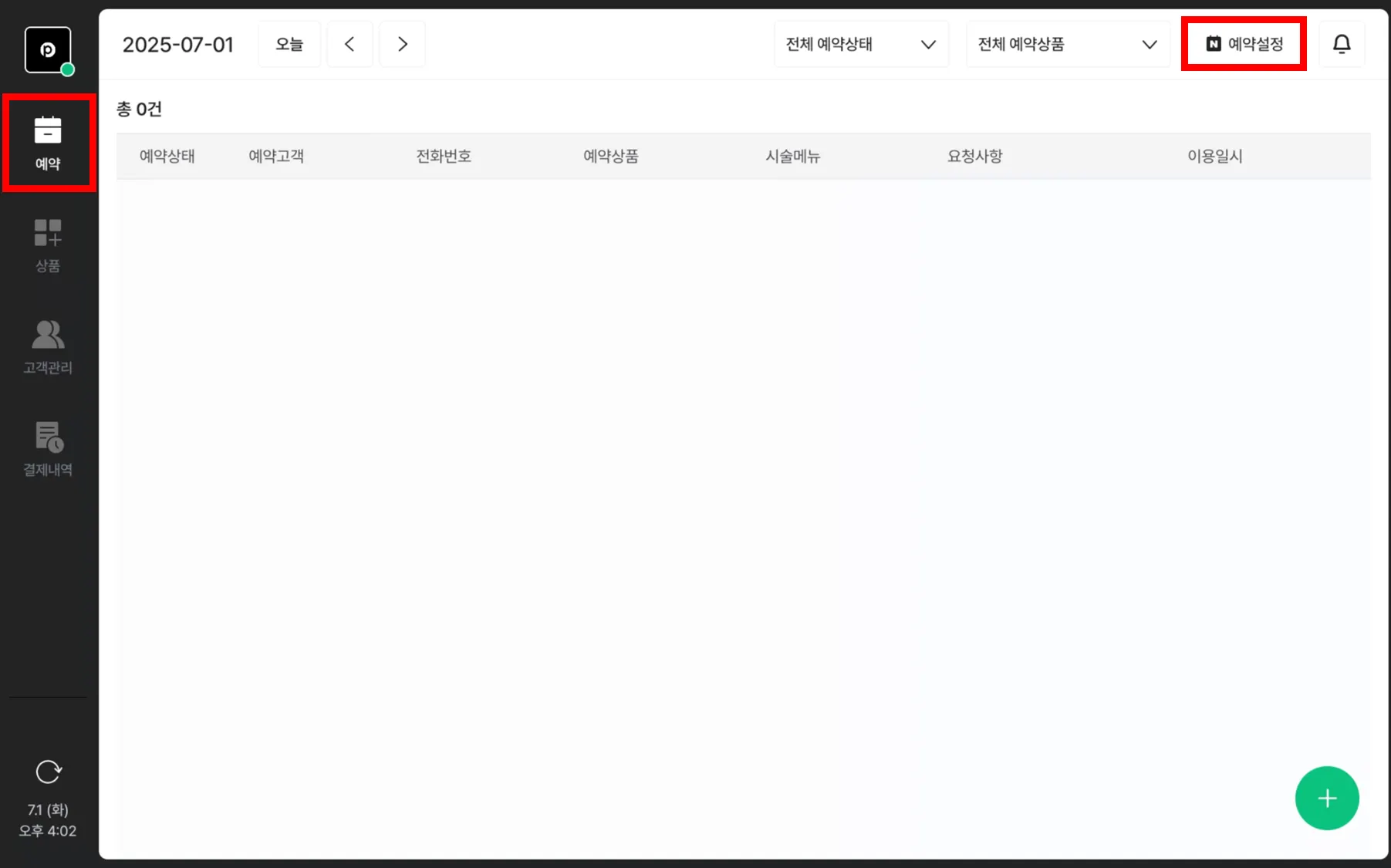 예약 탭에서 우측 상단의 예약 설정 버튼을 클릭해주세요.