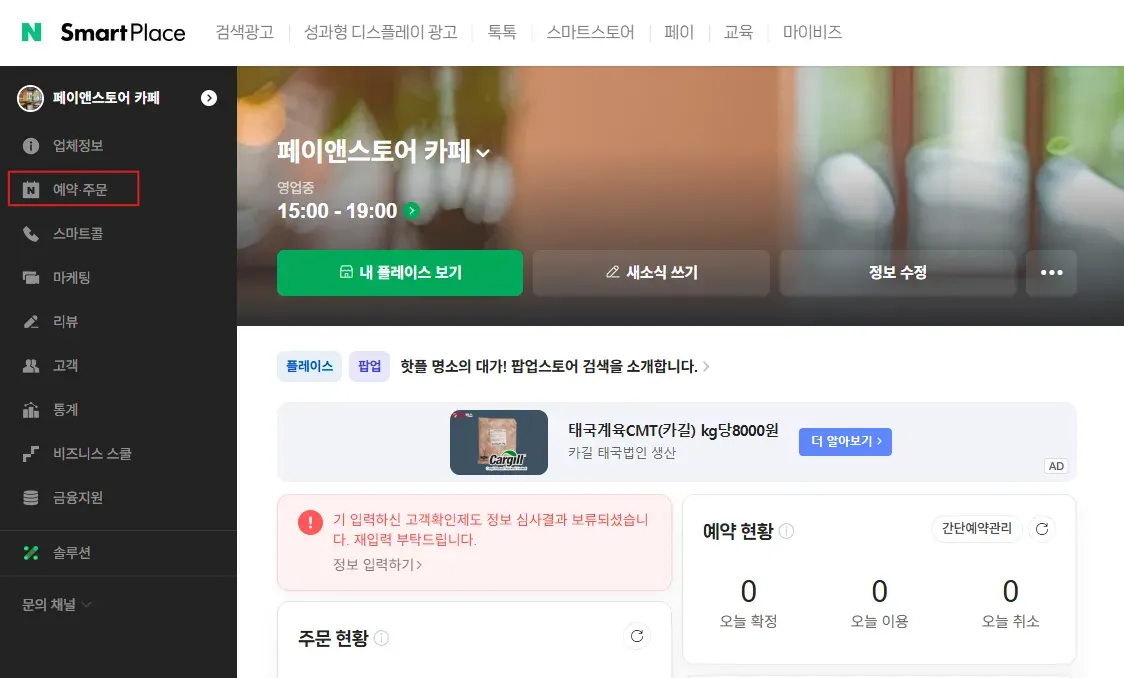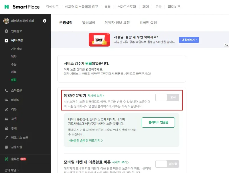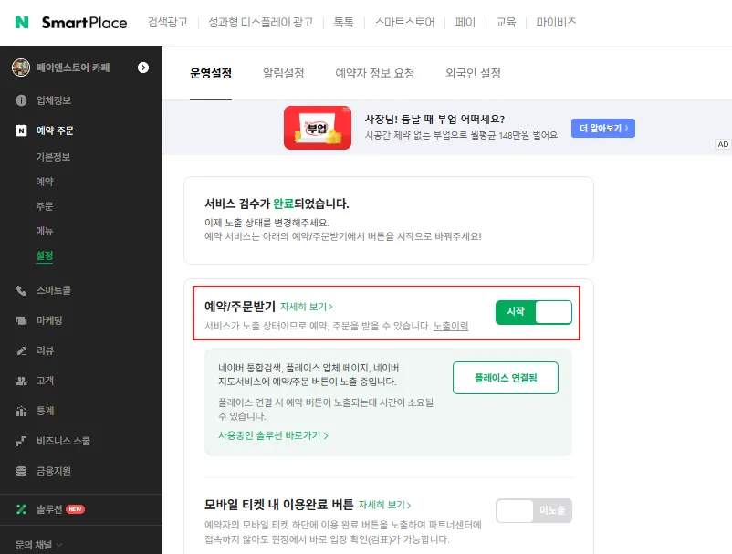 6) 예약/주문받기 버튼을 클릭하여 비활성화 해주세요.