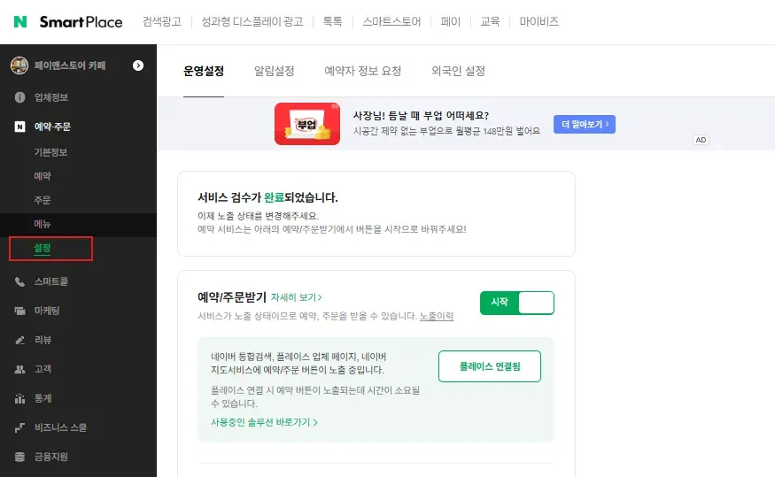 5) 왼쪽에 있는 예약/주문 카테고리 선택 후 설정을 클릭해 주세요.