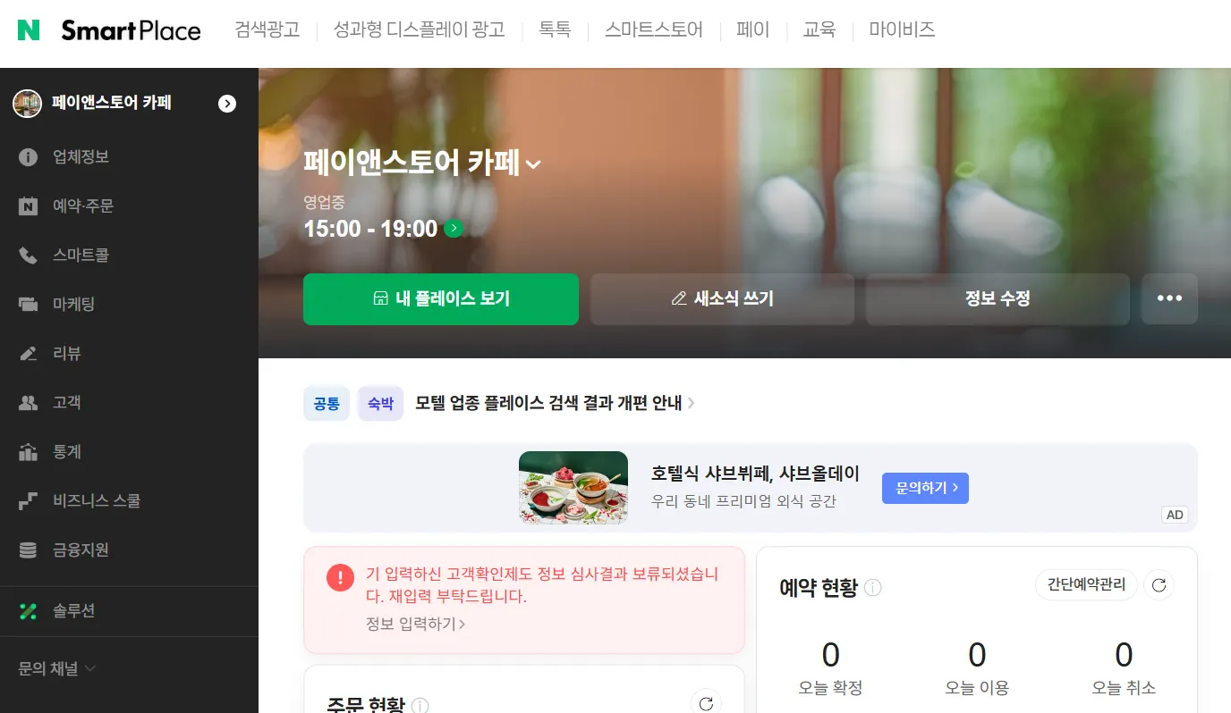 3) 사장님 페이지 설정 확인 및 완료 후 네이버 스마트플레이스 접속 후 예약/주문 카테고리의 설정 진입