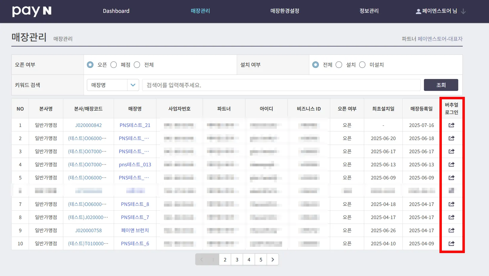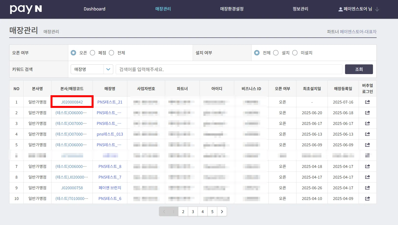 매장을 검색하거나 매장에 대한 최초 설치일, 매장등록일 등 정보 확인할 수 있어요.