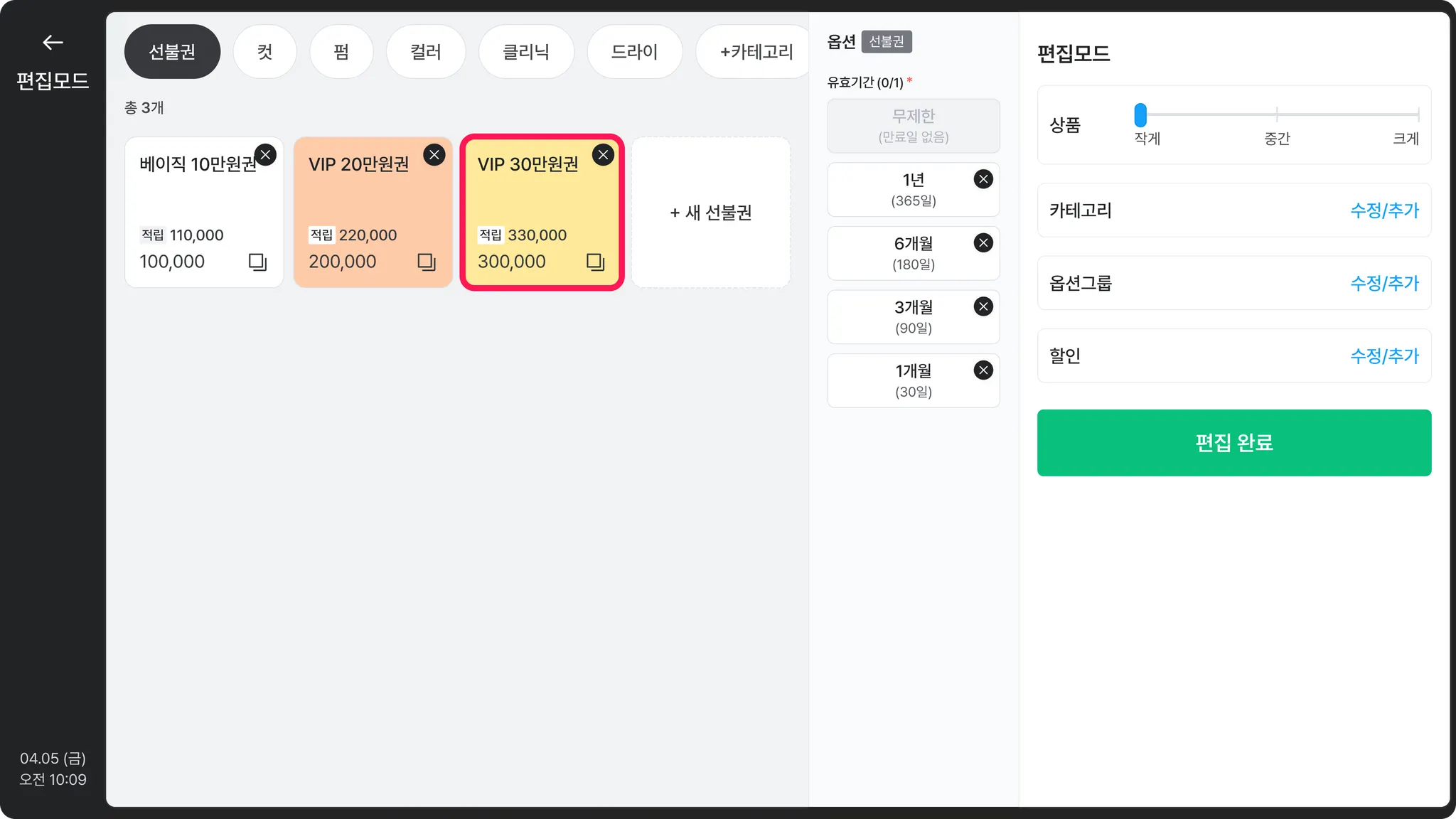 수정을 마친 후, [확인]을 눌러주세요. ex) VIP 30만원권 → VVIP 50만원권