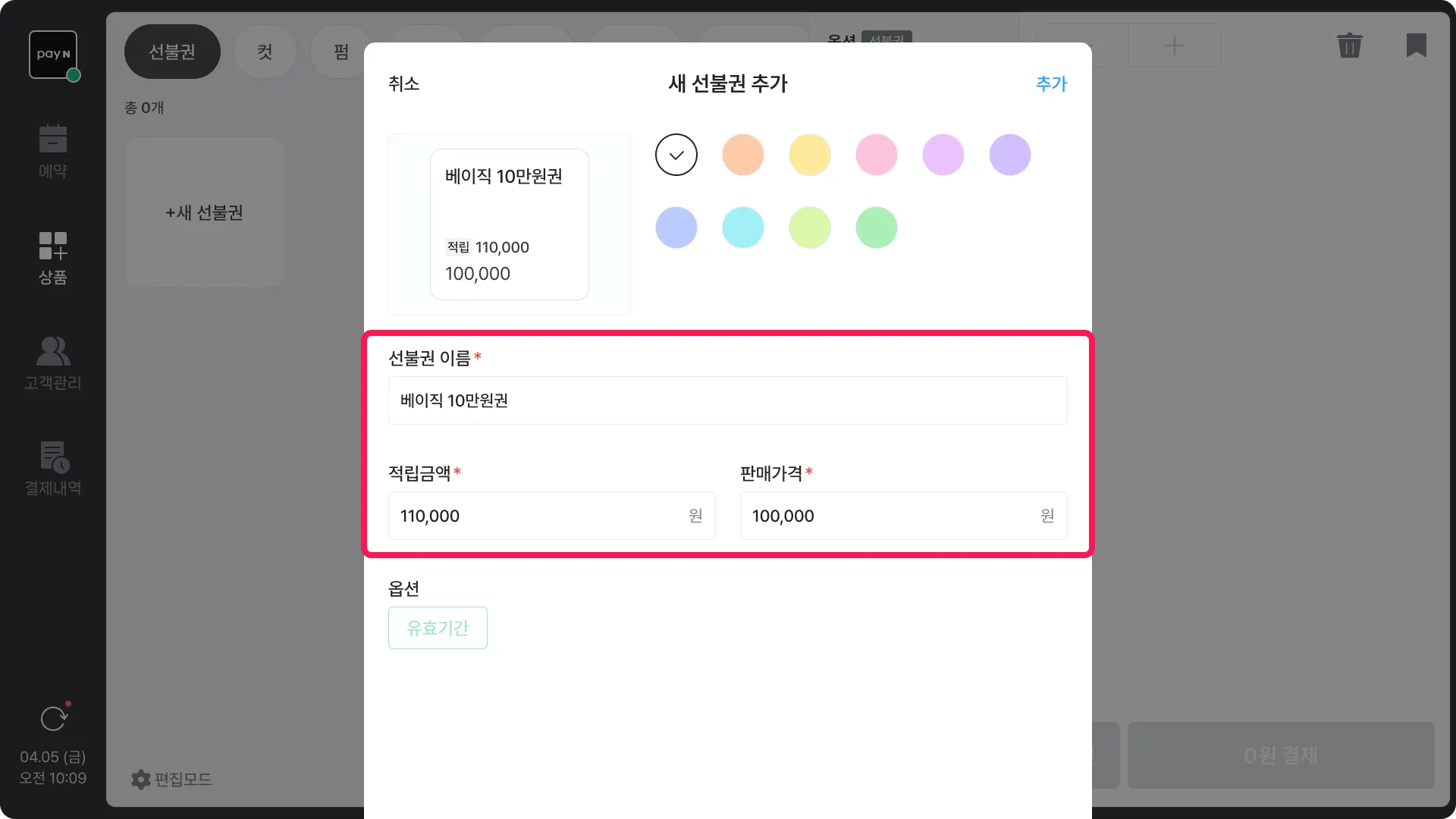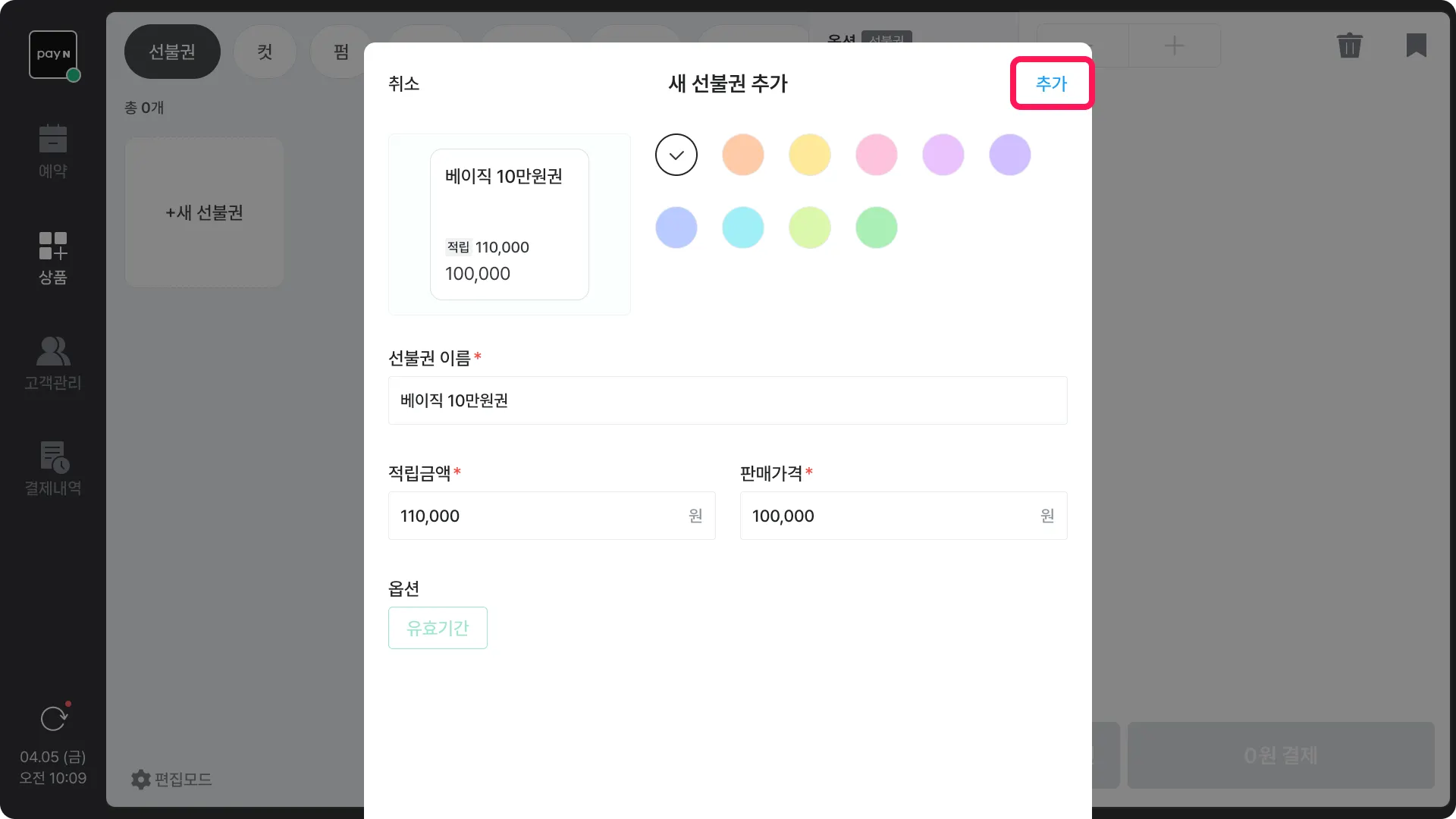 입력을 마친 후, [추가]를 눌러주세요.선불권 수정/삭제