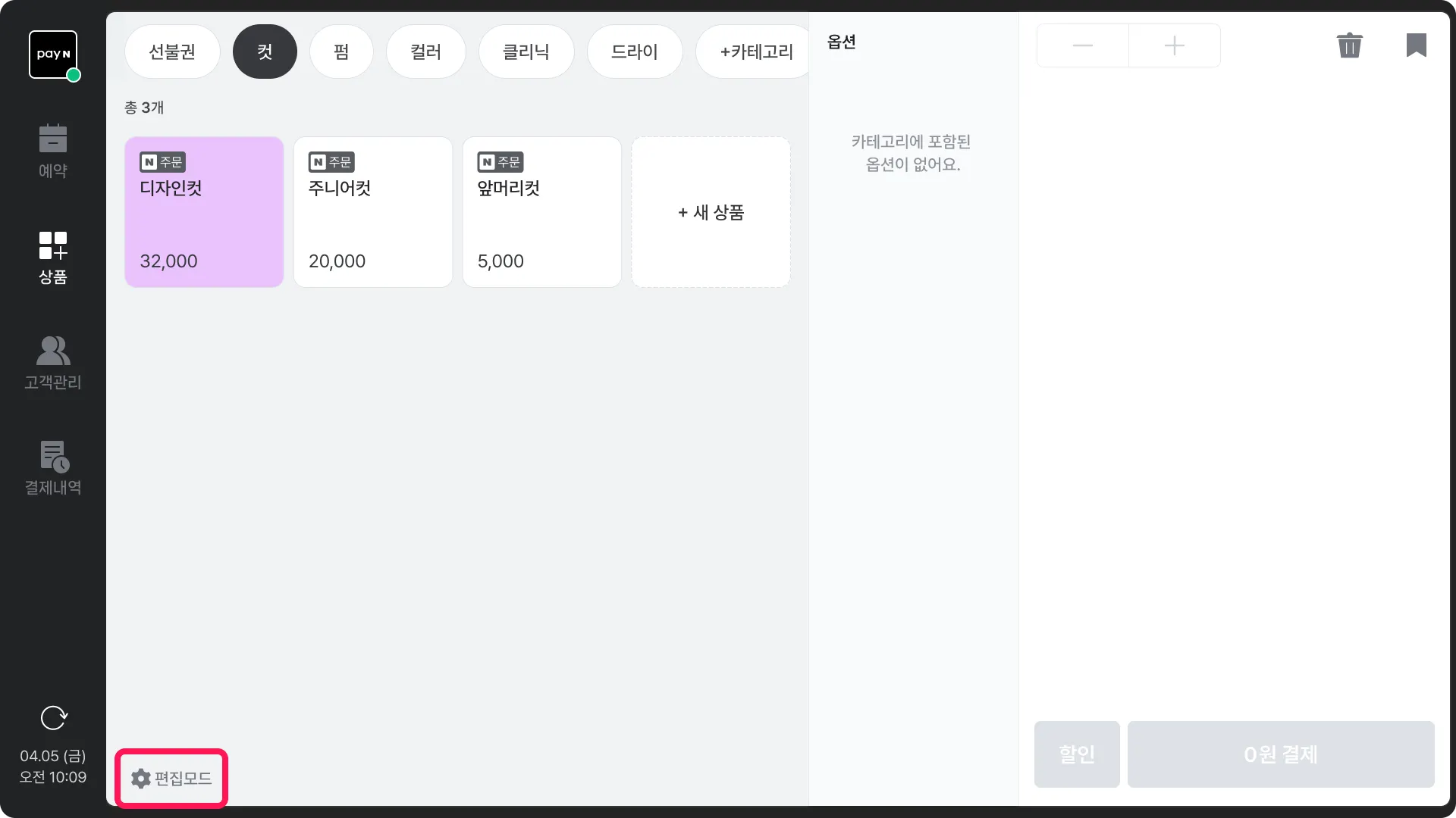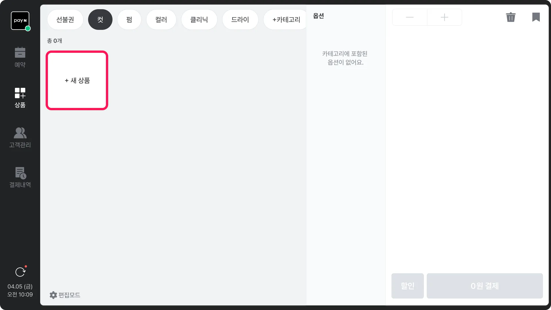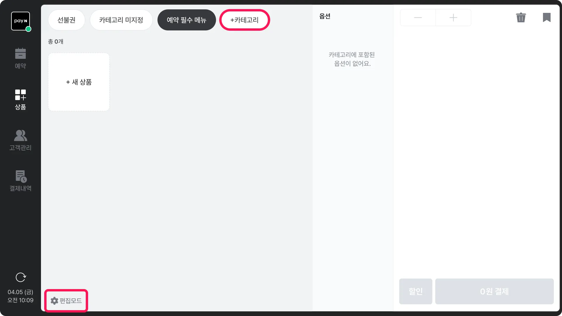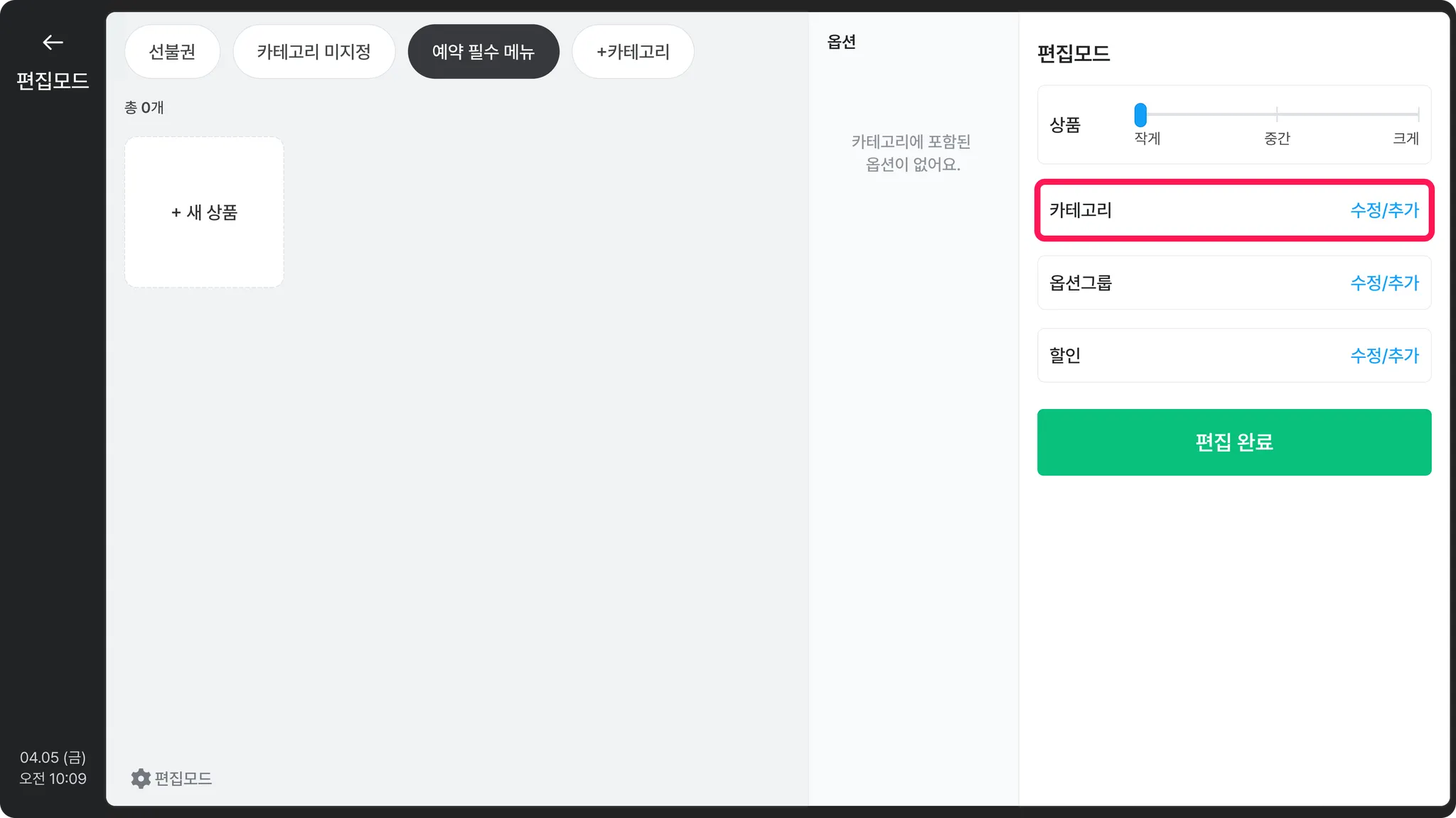 예약 상품 연동 시, 옵션을 사용할 수 없기 때문에 옵션은 포스에서 결제 시에만 적용 가능해요.옵션 그룹 추가