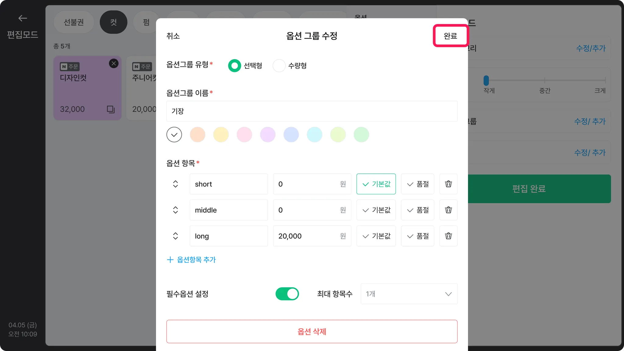 해당 옵션 그룹의 정보를 수정 후, [완료]를 눌러주세요.•