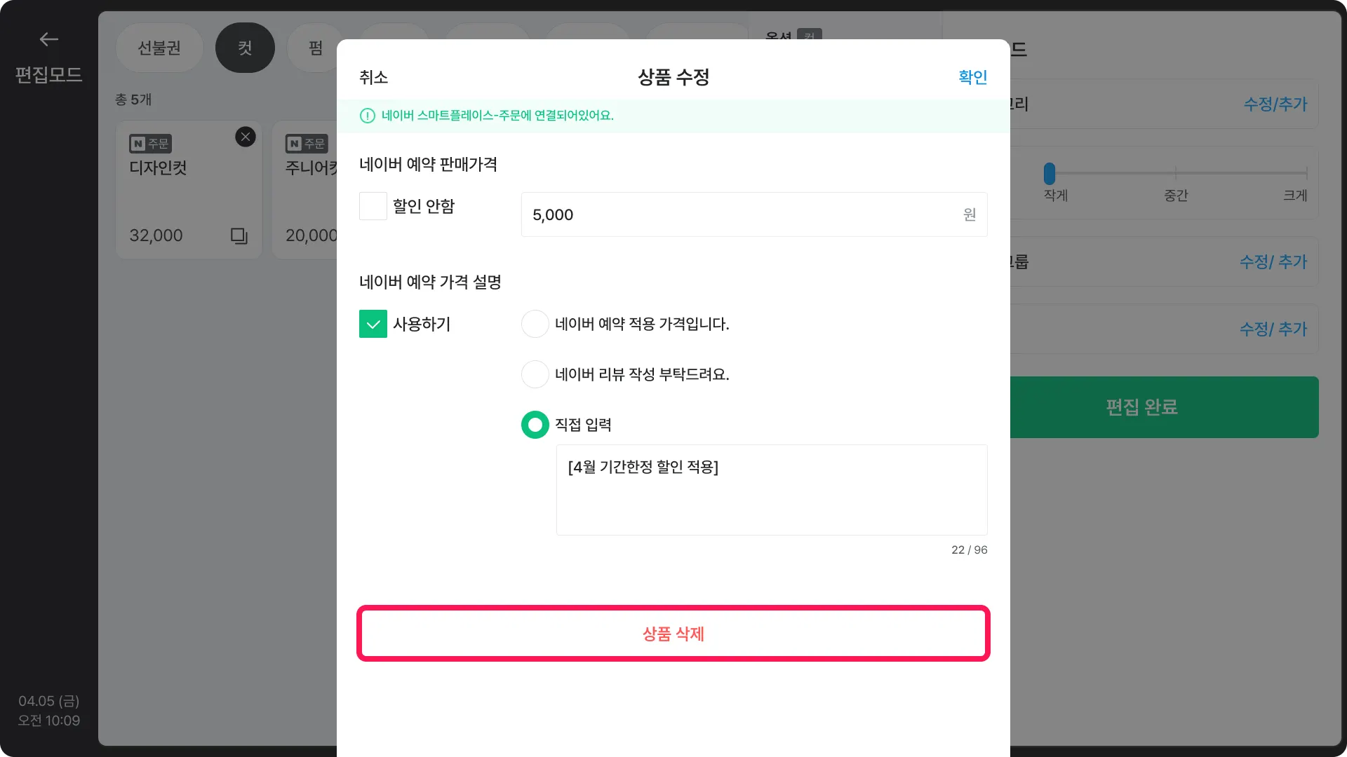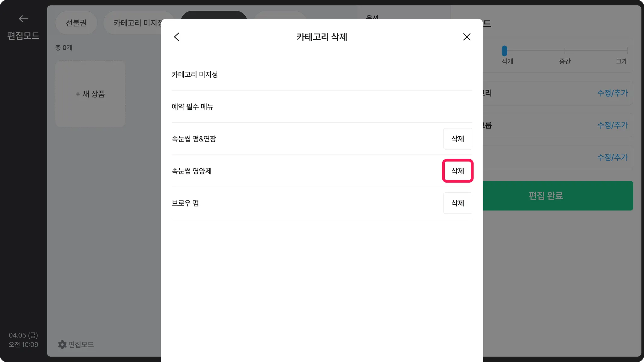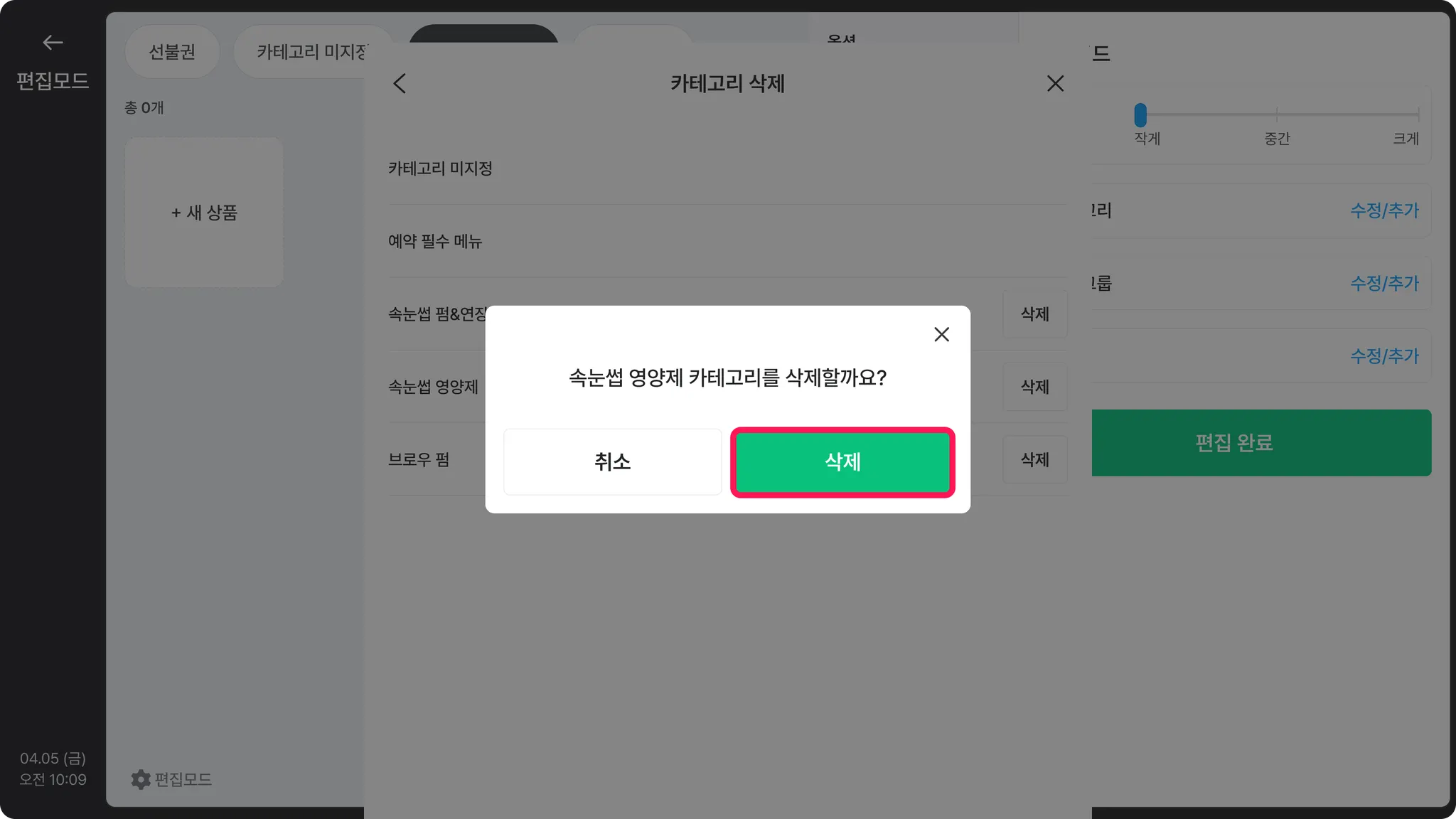확인창에서 한 번 더 [삭제]를 눌러주세요.포스 상품 관리