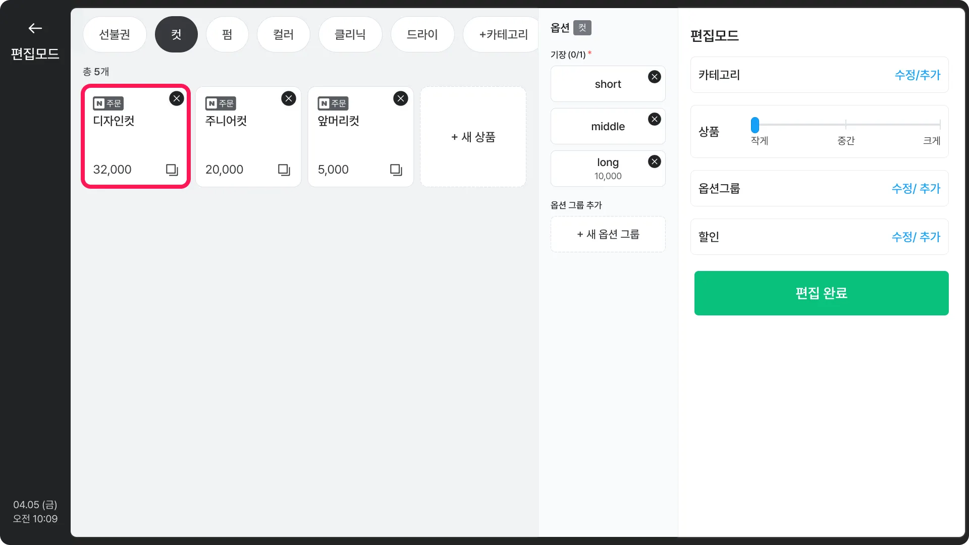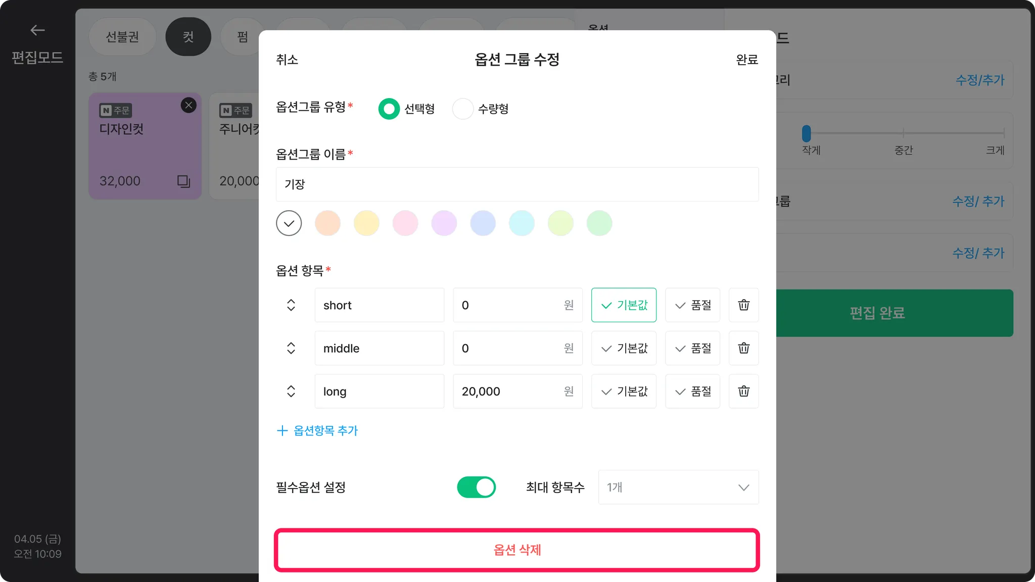 옵션 항목을 추가하거나 항목별 수정, 삭제할 수 있어요.