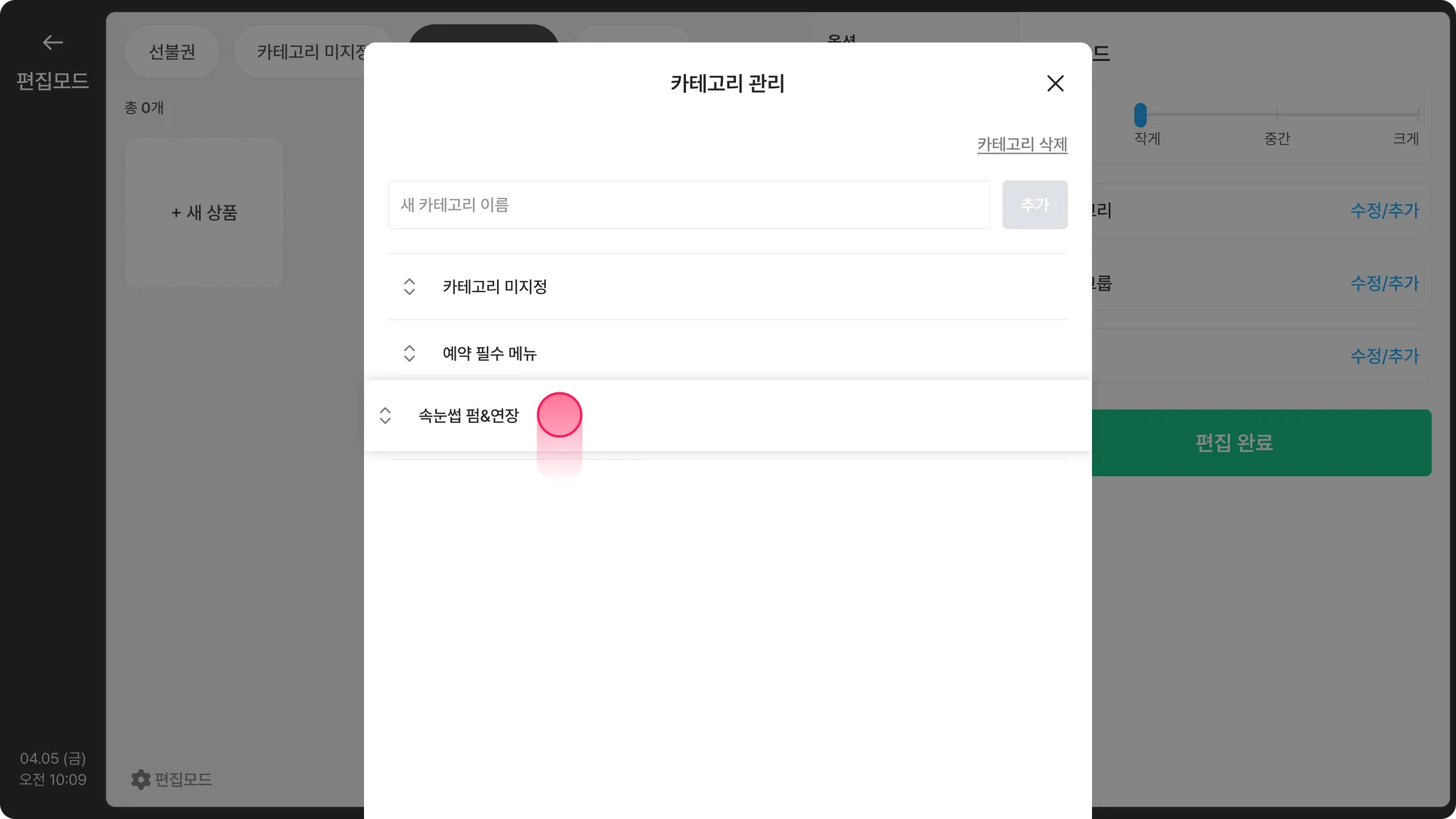 추가할 카테고리를 입력 후, [추가]를 눌러주세요. ex) 속눈썹 펌카테고리 수정