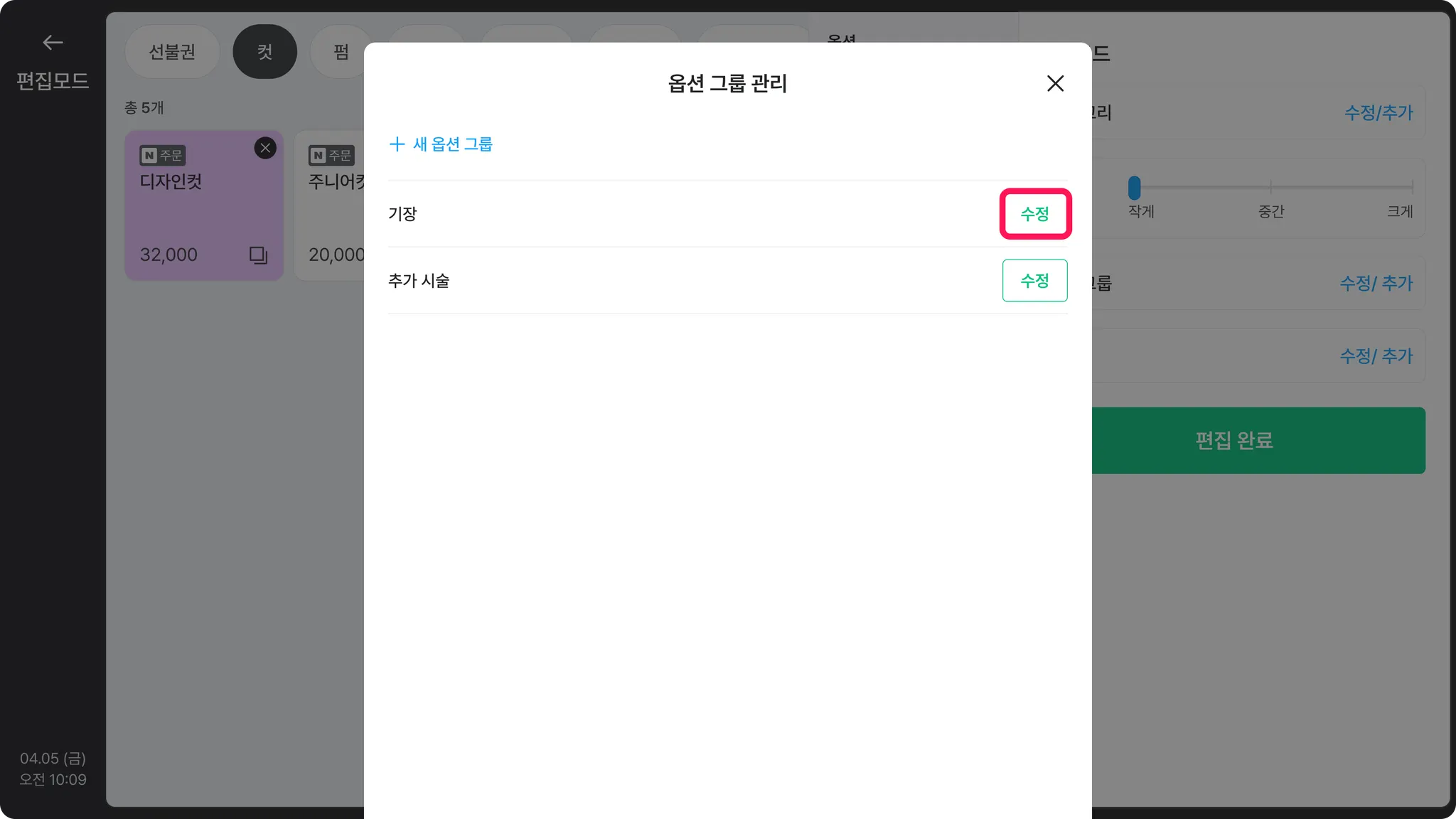 편집모드] > [옵션 그룹 수정/추가]를 눌러주세요.