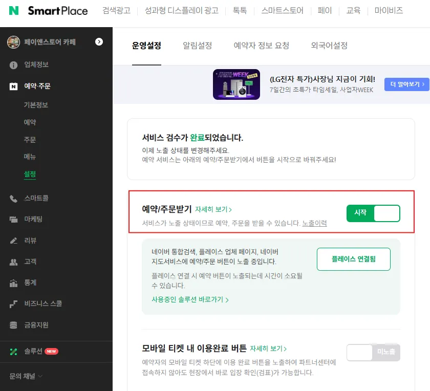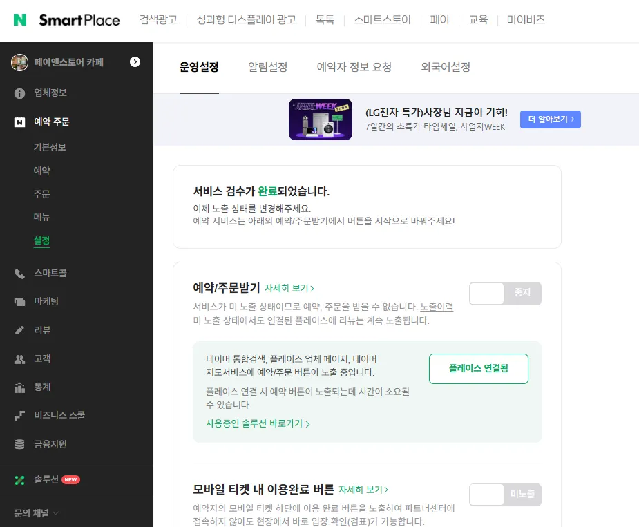 3) 사장님 페이지 설정 확인 및 완료 후 네이버 스마트플레이스 접속 후 예약/주문 카테고리의 설정 진입