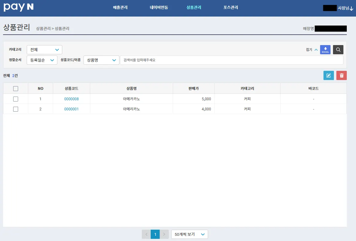 2) 페이앤 사장님 페이지를 통해 상품등록 확인 및 네이버 연동 확인