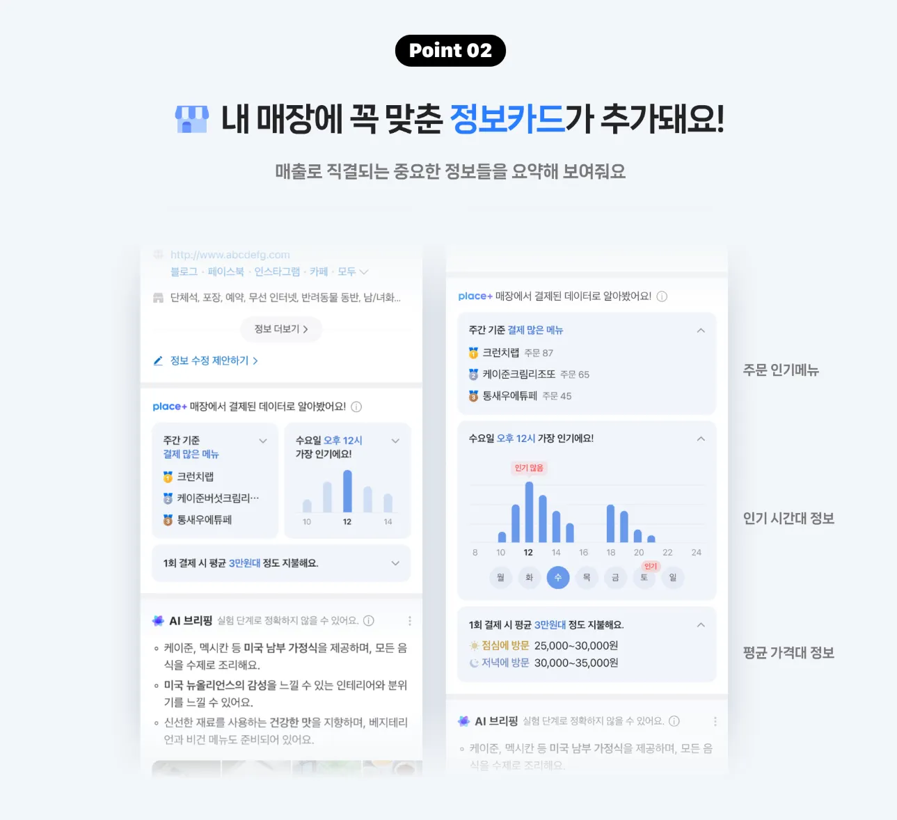 플레이스 상세페이지 ‘정보카드’에 고객의 관심을 끌 만한 유용한 정보를 담아 방문 의사결정을 도와줘요.