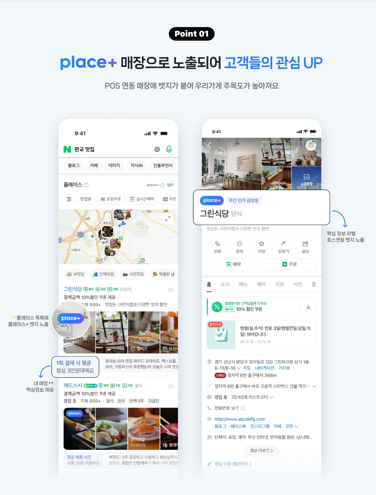 검색 목록에서 매장의 첫 번째 이미지에 Place+ 뱃지가 적용되어 높은 주목도는 물론,