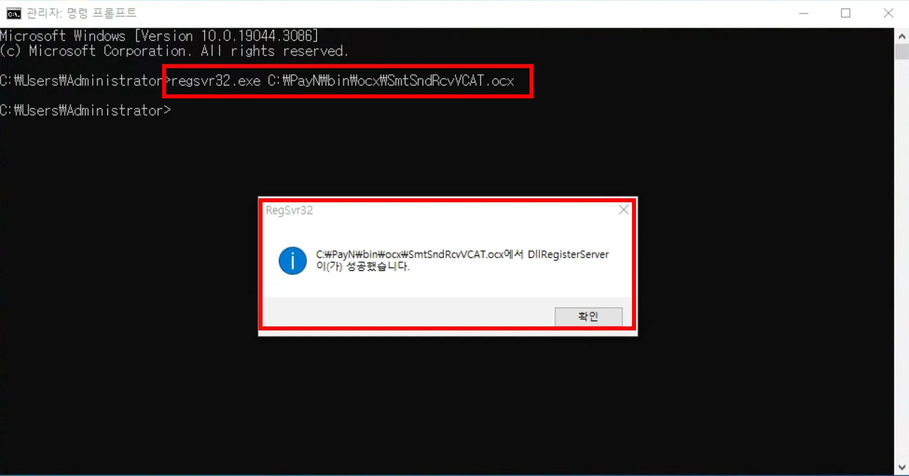 [regsvr32.exe C:\PayN\bin\ocx\SmtSndRcvVCAT.ocx] 를 입력해주세요.